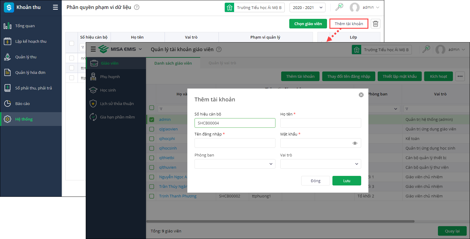 - Với những giáo viên chưa có trong danh sách, anh/chị nhấn Thêm tài khoản để thêm thông tài khoản/phân quyền sử dụng tính năng cho giáo viên đó.