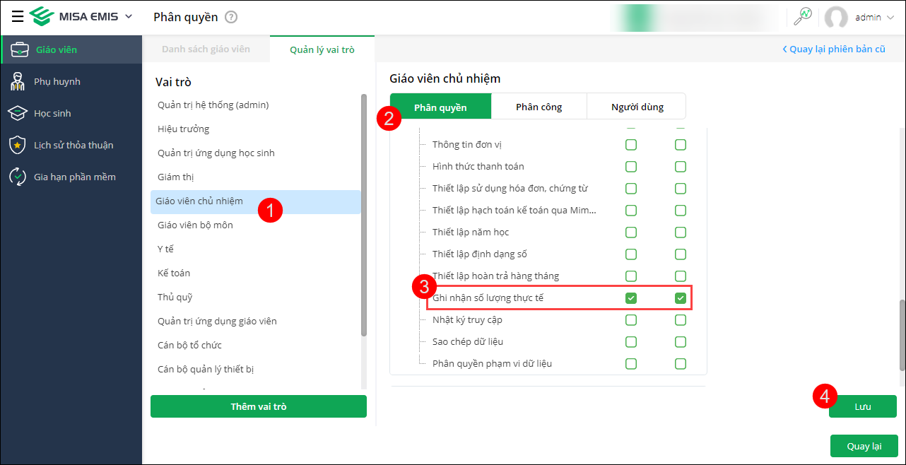 Để phân quyền được cho các tài khoản cán bộ/giáo viên thu tiền, chấm ăn, ghi nhận số lượng sử dụng,… cho lớp phụ trách thì kế toán cần phân quyền cho tài khoản/giáo viên sử dụng các tính năng trên các EMIS – Khoản thu (Xem hướng dẫn tại đây)