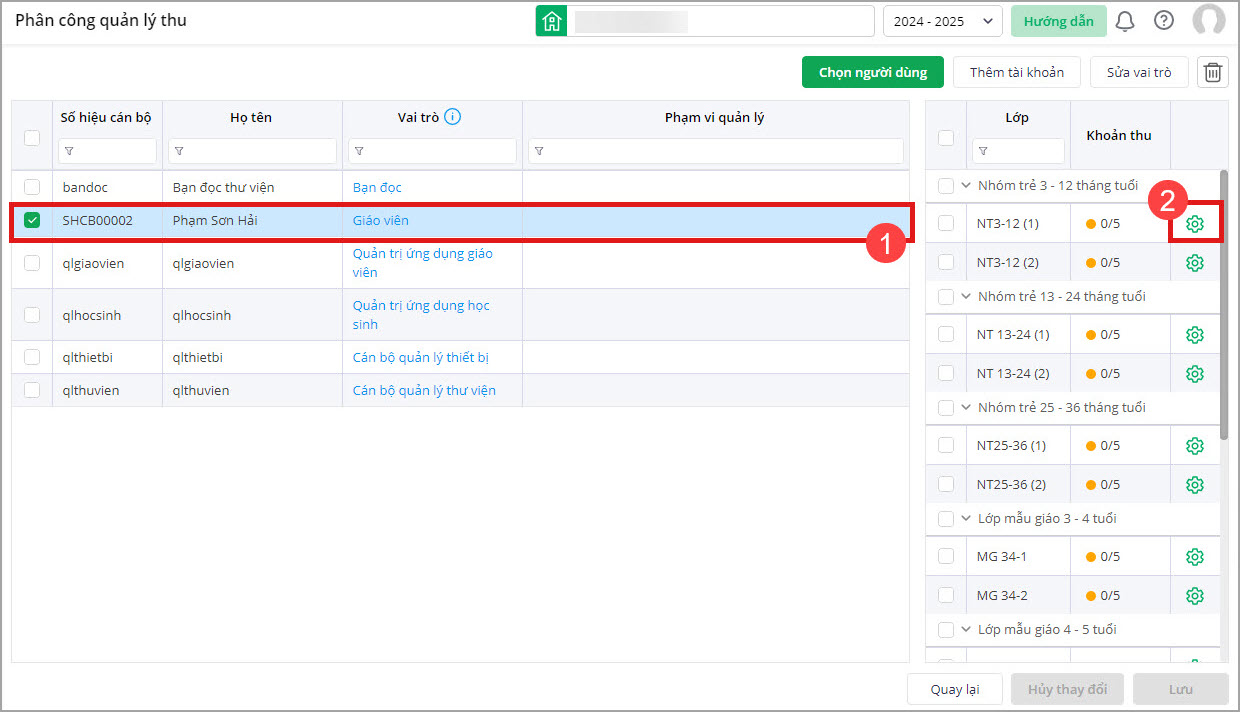 - Khi muốn phân quyền quản lý thu cho giáo viên nào, anh/chị chọn vào giáo viên đó, sau đó chọn biểu tượng phân quyền khoản thu trong lớp