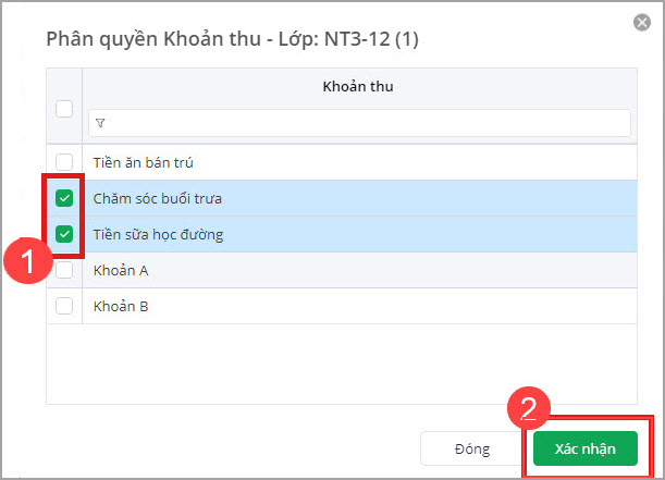 - Tích chọn khoản thu mà giáo viên đó được phân quyền thu trong lớp, chọn Xác nhận