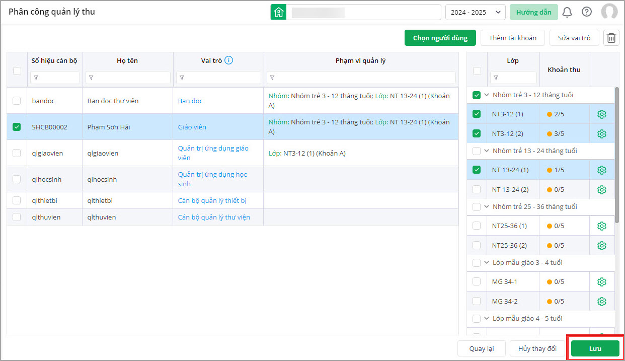 - Sau khi phân quyền khoản thu xong, anh/chị chọn Lưu