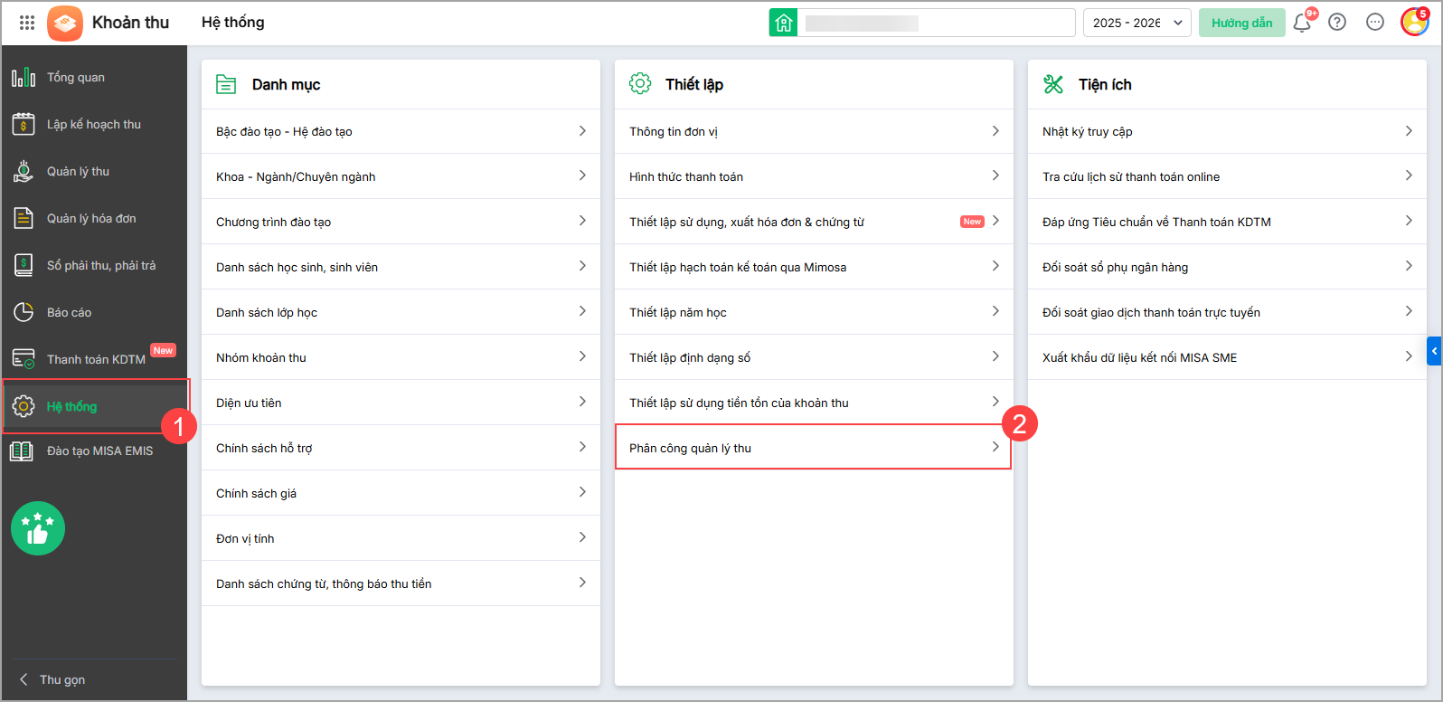 - Vào Hệ thống\Thiết lập\Phân công quản lý thu.