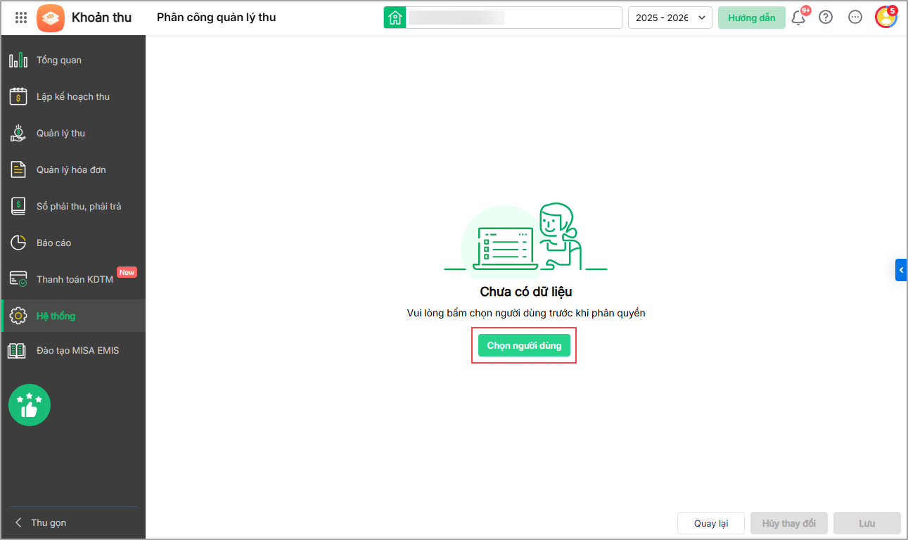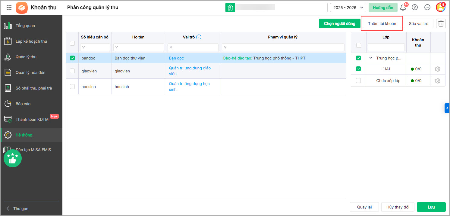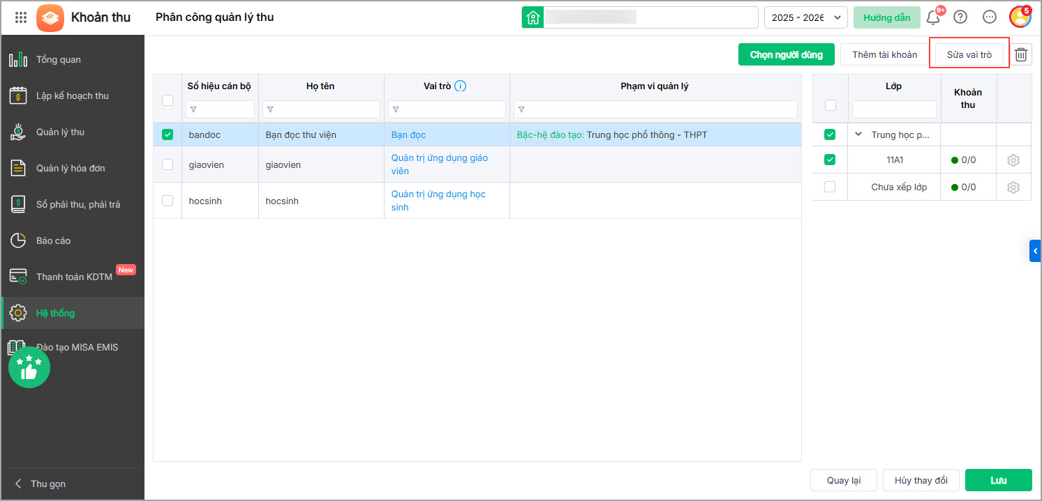 - Sau khi hoàn tất, nhấn Lưu. Phần mềm tự động điều hướng về phân hệ Khoản thu và hiển thị thông báo cập nhật vai trò thành công.