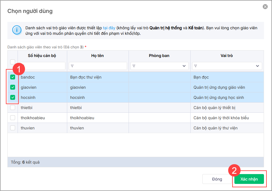 Tích chọn giáo viên cần thiết lập phân quyền chi tiết, nhấn Xác nhận