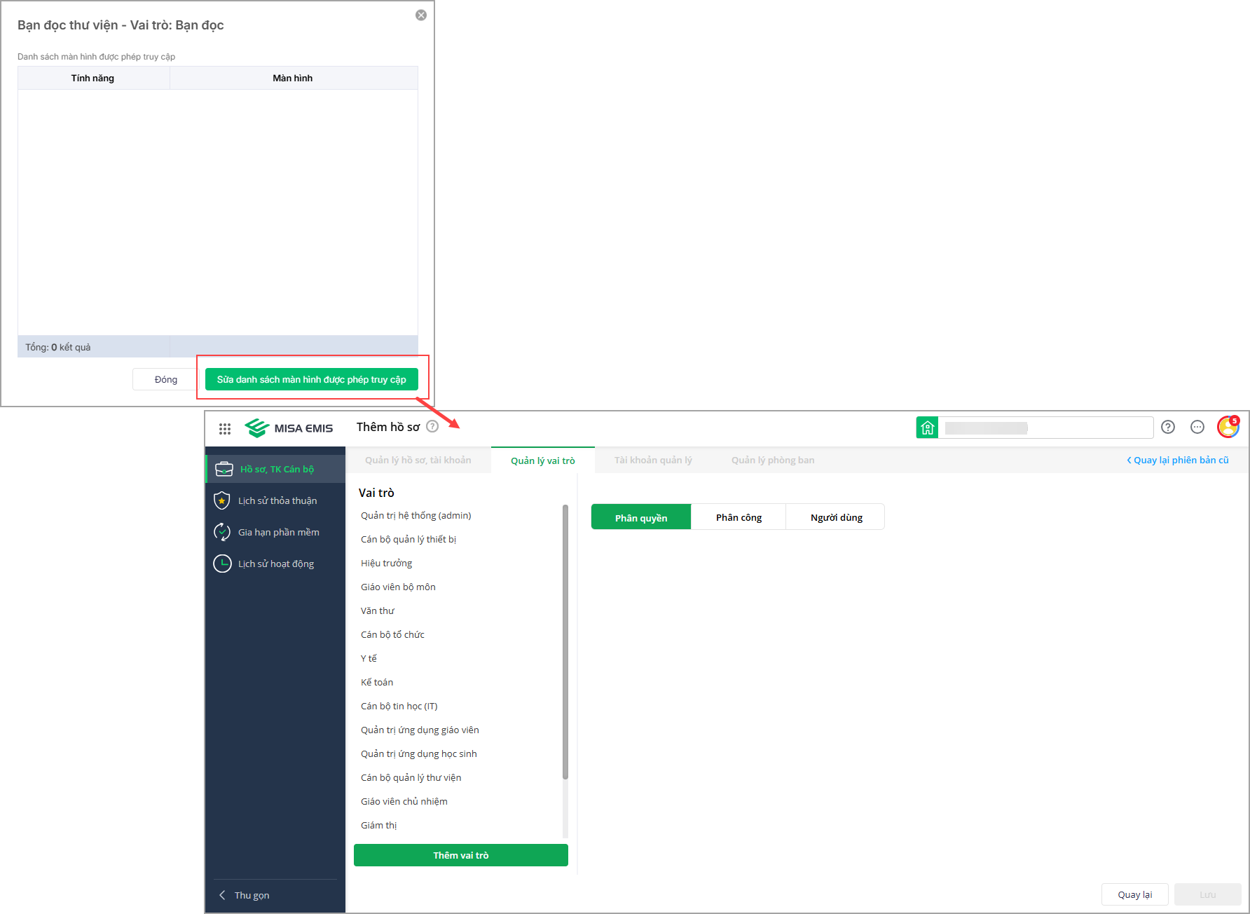Lưu ý: Trường hợp muốn thay đổi danh sách màn hình được phép truy cập cho từng vai trò, anh/chị chọn Sửa danh sách màn hình được phép truy cập và làm theo hướng dẫn chi tiết tại đây.