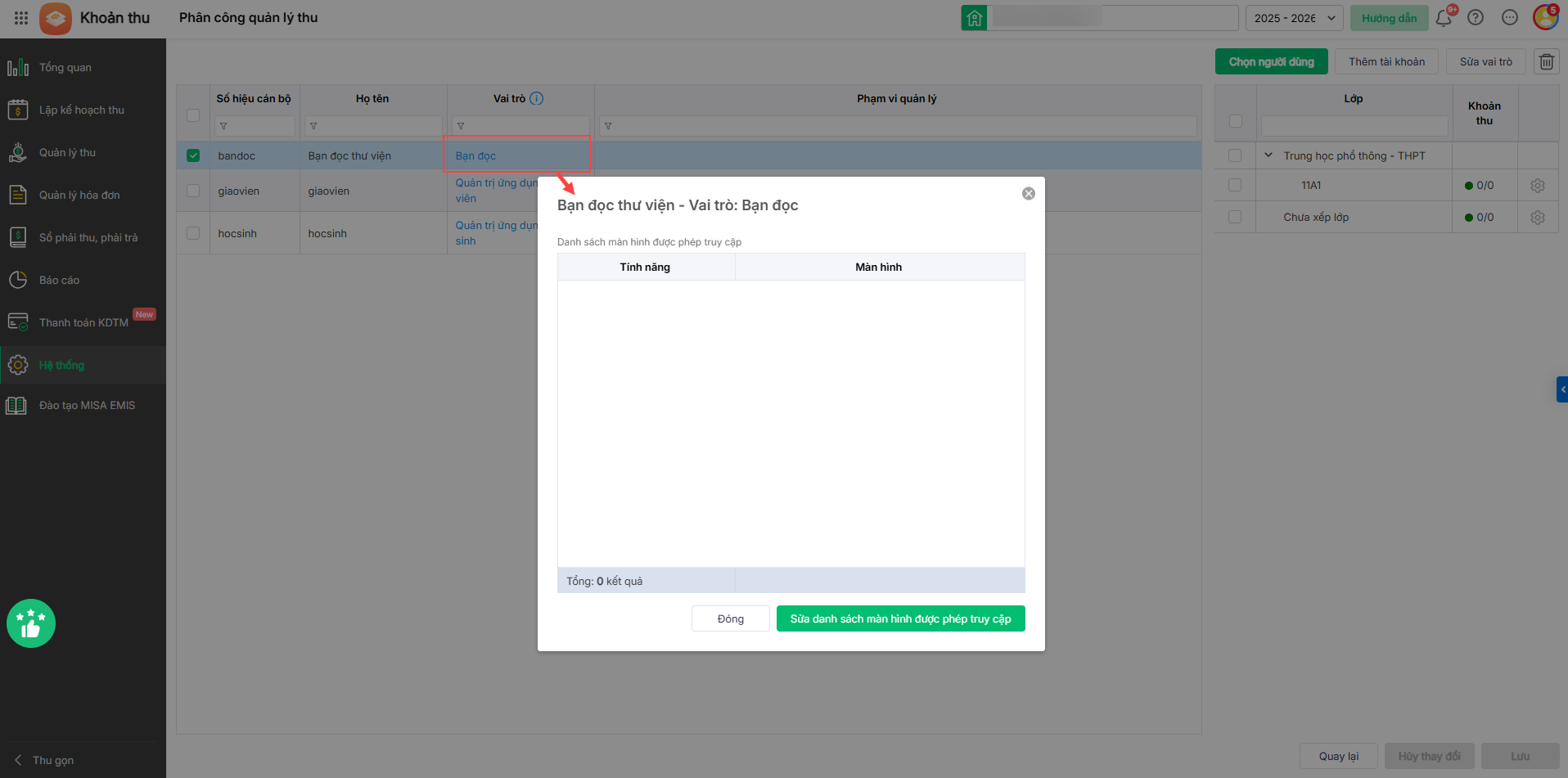 - Phần mềm hiển thị Danh sách giáo viên đã được phân quyền sử dụng tính năng trên EMIS – Khoản thu (trừ vai trò Quản trị hệ thống).