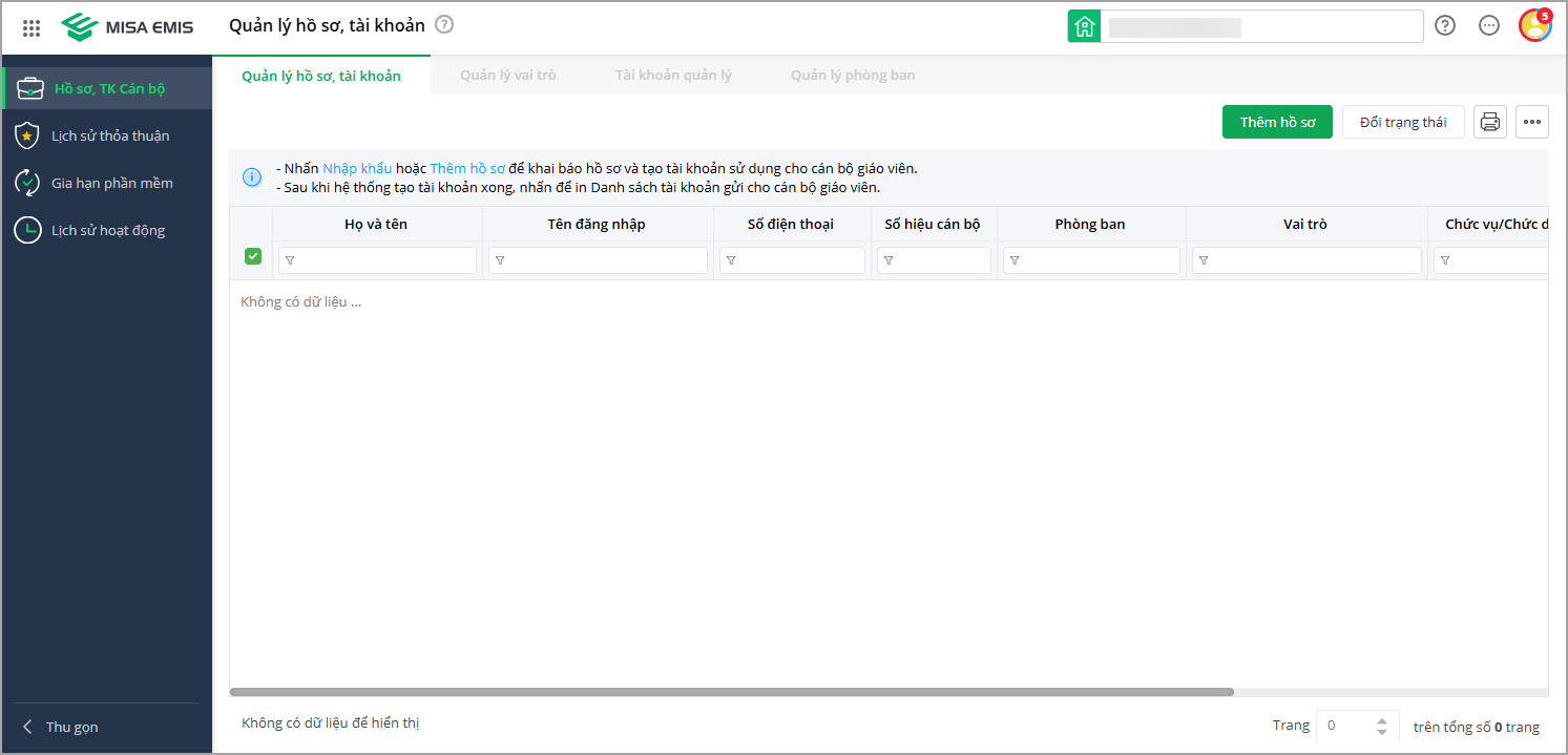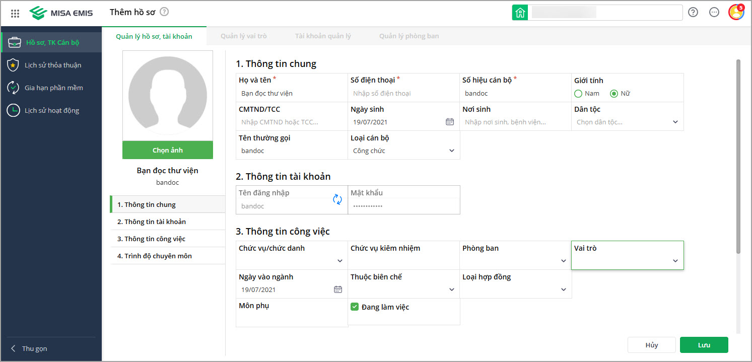- Phần mềm điều hướng sang mục Quản lý hồ sơ, tài khoản. Anh/chị chọn vai trò mới bằng cách nhấn vào dấu mũi tên.