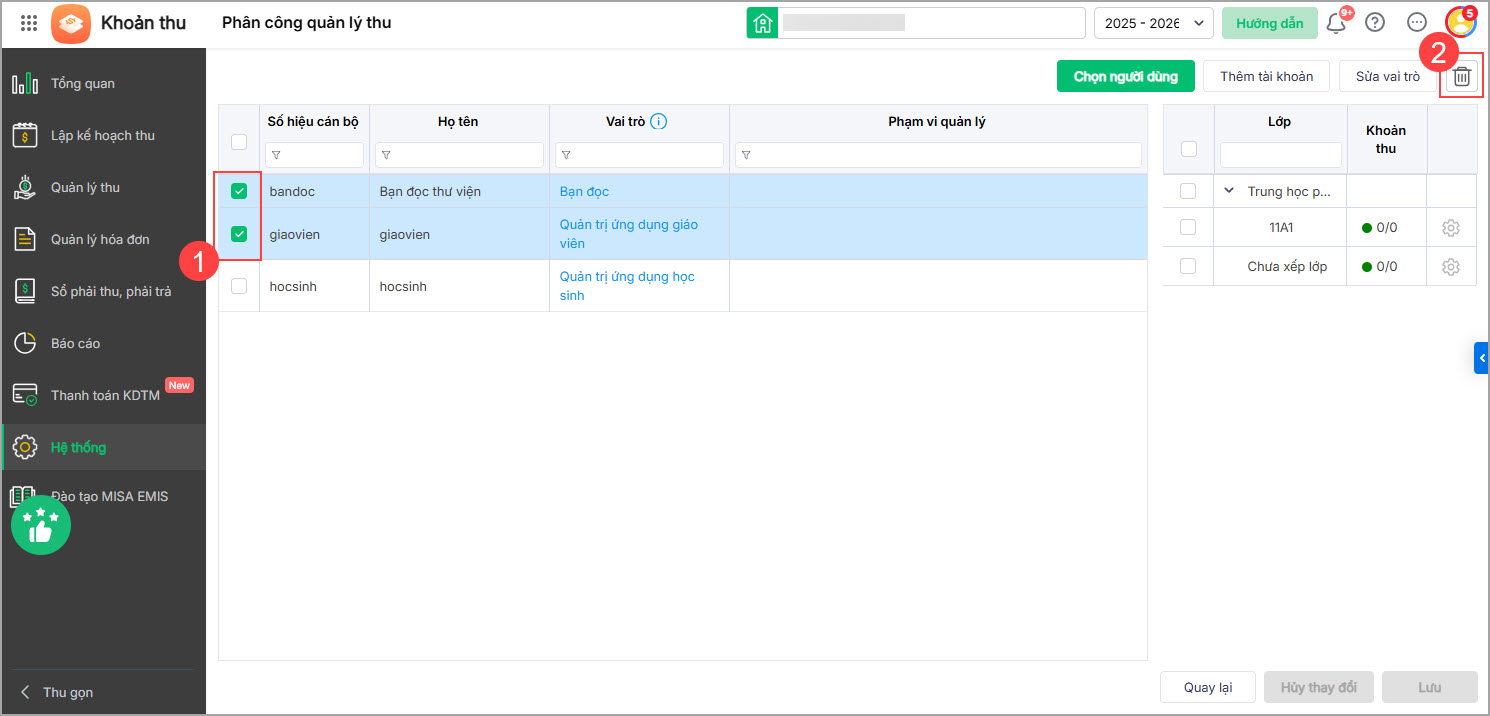 3. Để xóa tài khoản cán bộ, giáo viên đã được phân công quản lý thu, anh/chị tích chọn giáo viên và nhấn vào biểu tượng thùng rác.
