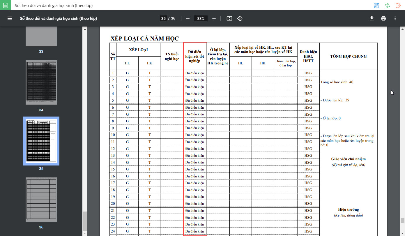 - Nhấn Đồng ý, kiểm tra số liệu trên Sổ theo dõi và đánh giá học sinh (theo lớp).