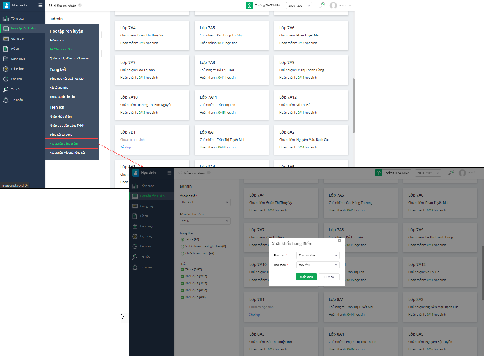 - Nhấn Xuất khẩu.Các thông tin đã được giáo viên thiết lập ẩn không còn hiển thị trên bảng điểm.Xem hướng dẫn chi tiết tại đây.