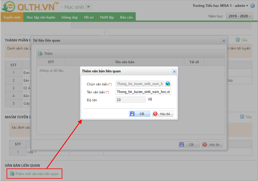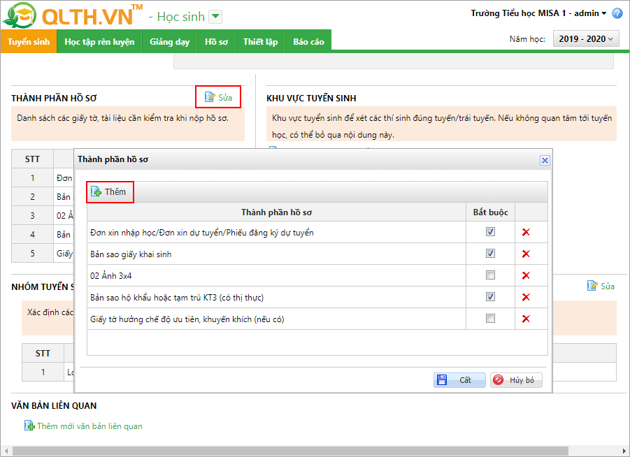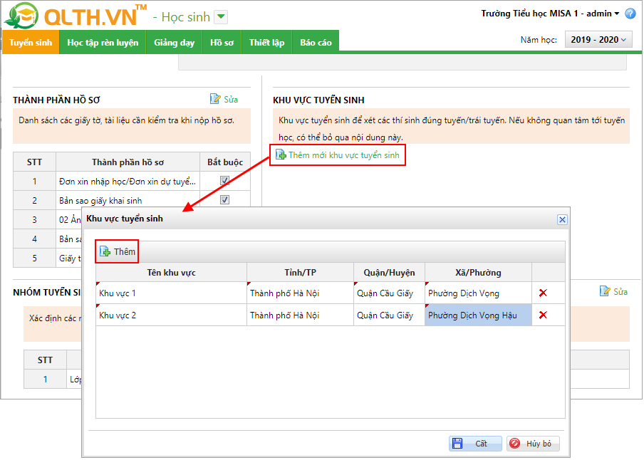 - Trên giao diện Kế hoạch tuyển sinh chọn mục Khu vực tuyển sinh, thực hiện thêm mới thành phần hồ sơ như sau