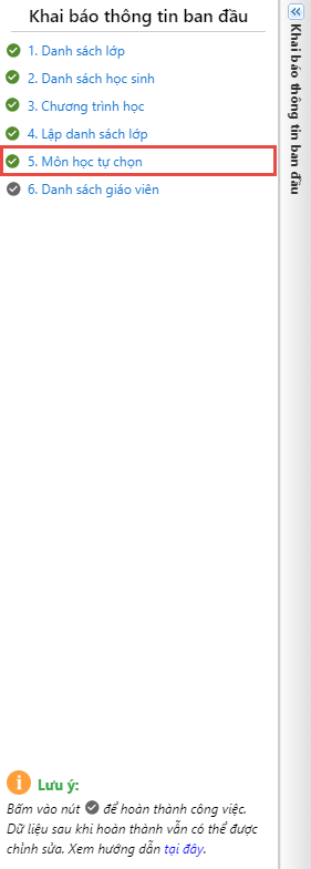 tại phần Khai báo thông tin ban đầu, chọn tab 5. Môn học tự chọn.
