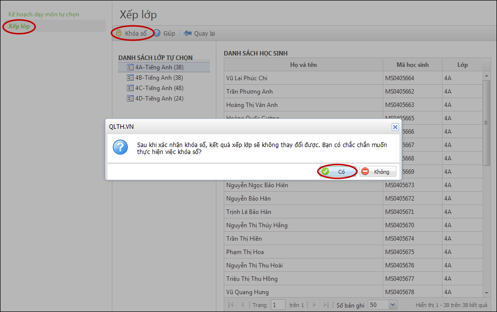 2. Kiểm tra danh sách học sinh đăng ký học theo lớp đã chọn ở bước 1.