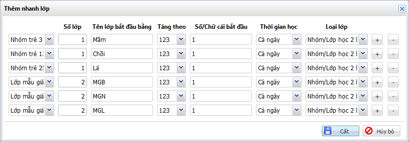 theo 123 và Số/Chữ cái bắt đầu là 1.- Các lớp được đặt tên theo thứ tự A, B, C,… (VD: Mầm A, Mầm B, Mầm C). Thực hiện nhập Tên lớp bắt đầu bằng Mầm, Tăng theo ABC và Số/Chữ cái bắt đầu là A.