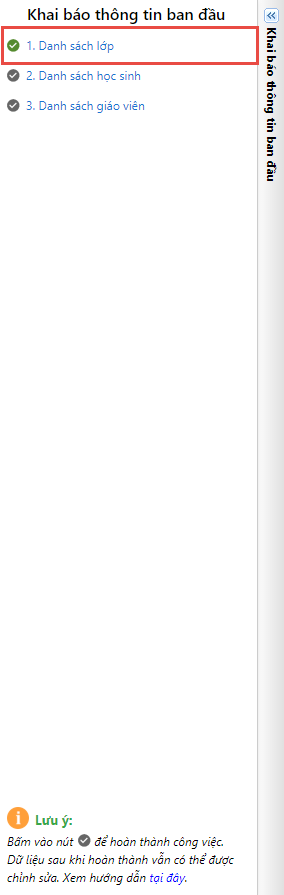 Lưu ý: Sau khi khai báo xong danh sách lớp học, cần phải xác nhận hoàn thành đối với thông tin vừa khai báo bằng cách nhấn vào biểu tượng