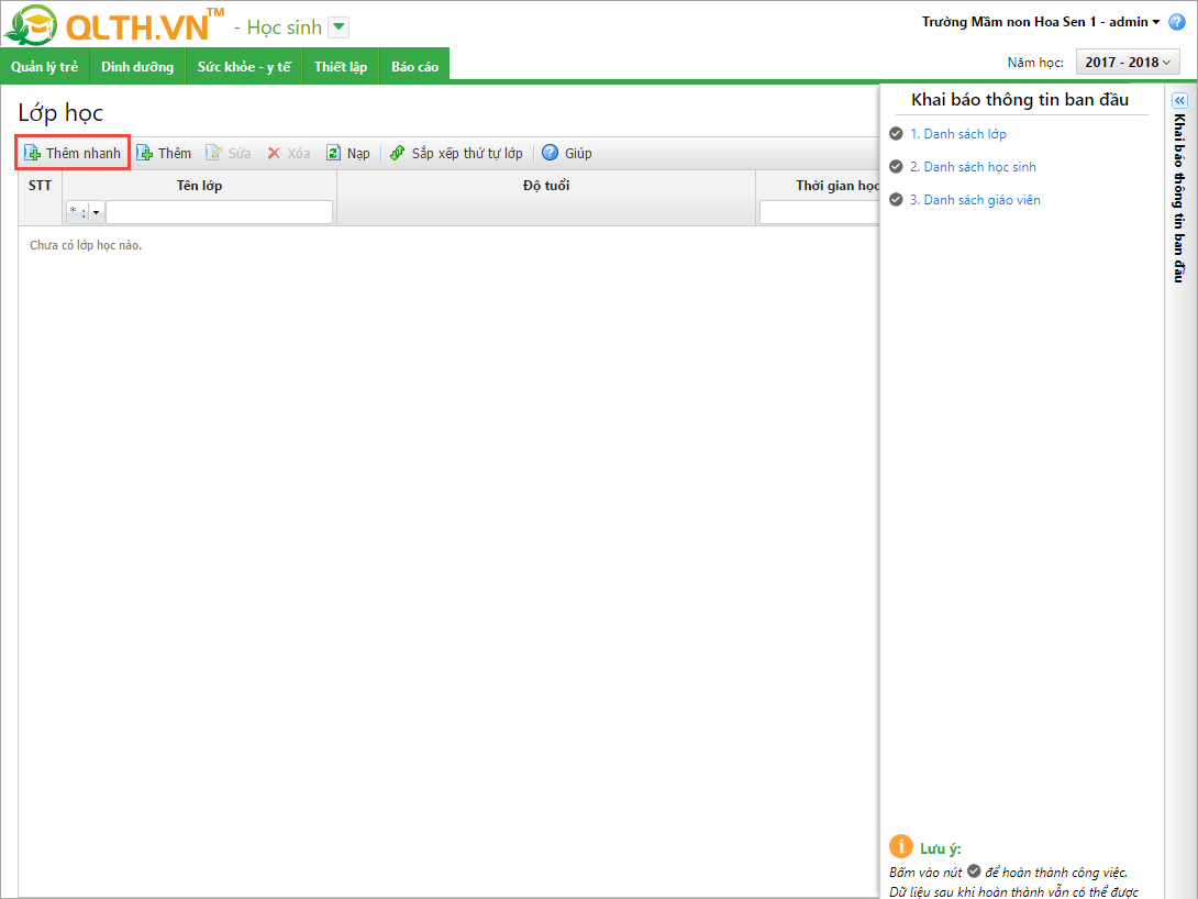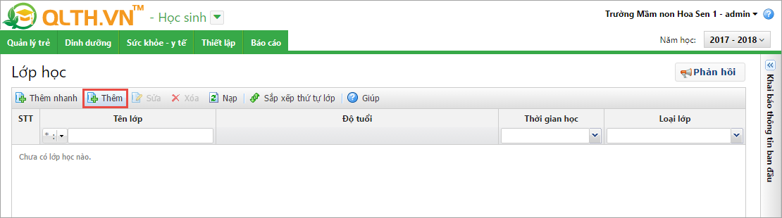 1. Nhấn vào biểu tượngtại phần Khai báo thông tin ban đầu, chọn tab 1. Danh sách lớp.