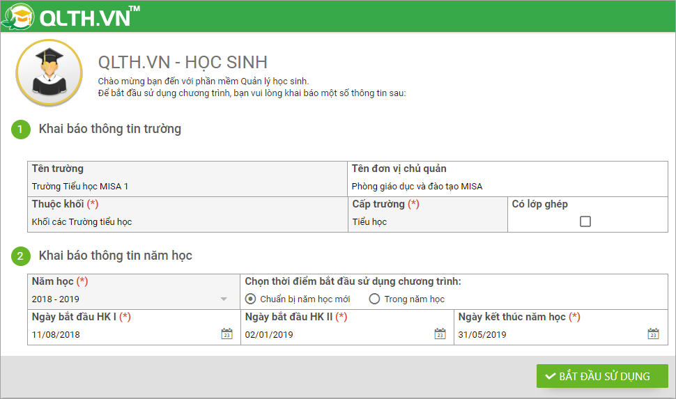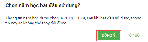 3. Nhấn Bắt đầu sử dụng. Phần mềm hiển thị thông báo, anh/chị nhấn Đồng ý để xác nhận năm học mới và khai báo các thông tin bắt đầu sử dụng.