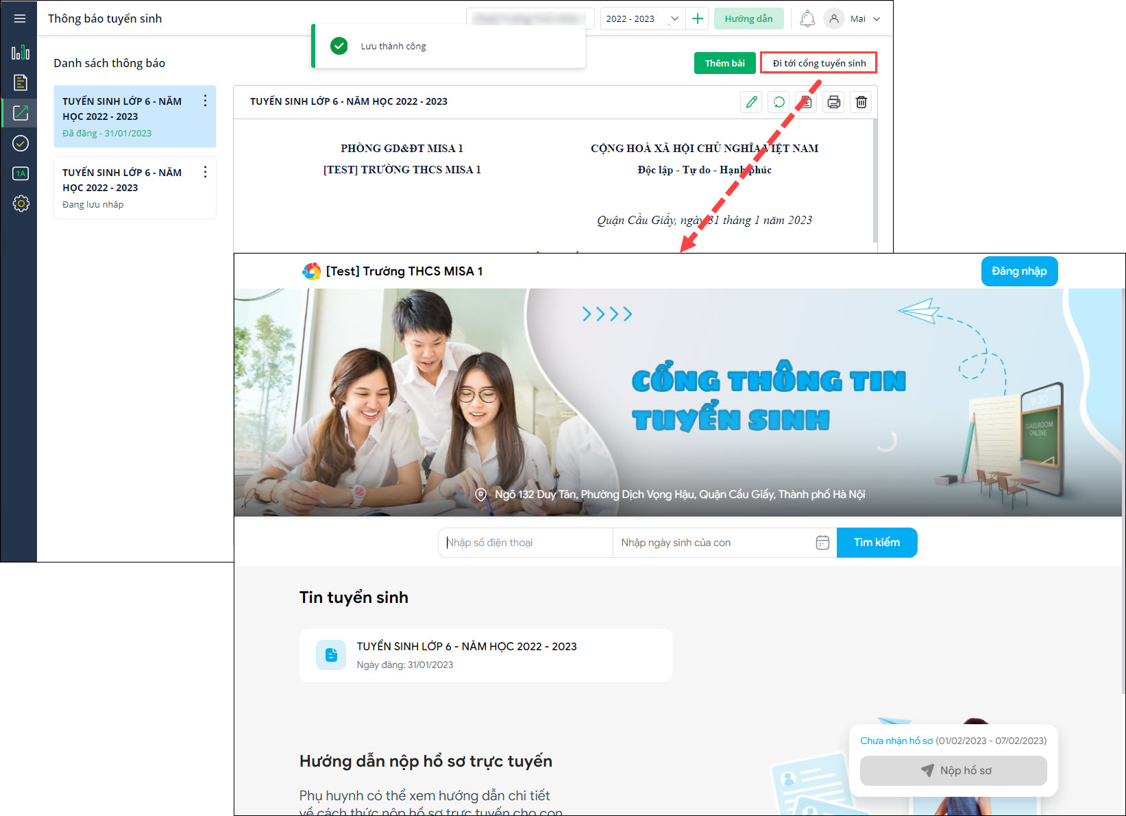 - Tại mục Thông báo tuyển sinh, Nhà trường cũng có thể thêm tin bài, thông báo đến phụ huynh trong quá trình tuyển sinh theo hướng dẫn chi tiết tại đây.
