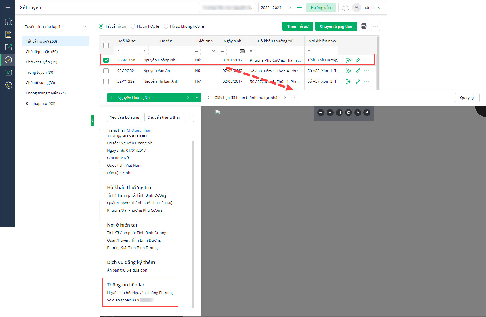 - Tại mục Xét tuyển, Cán bộ tuyển sinh có thể nhấn chọn hồ sơ học sinh để xem thông tin người liên hệ.
