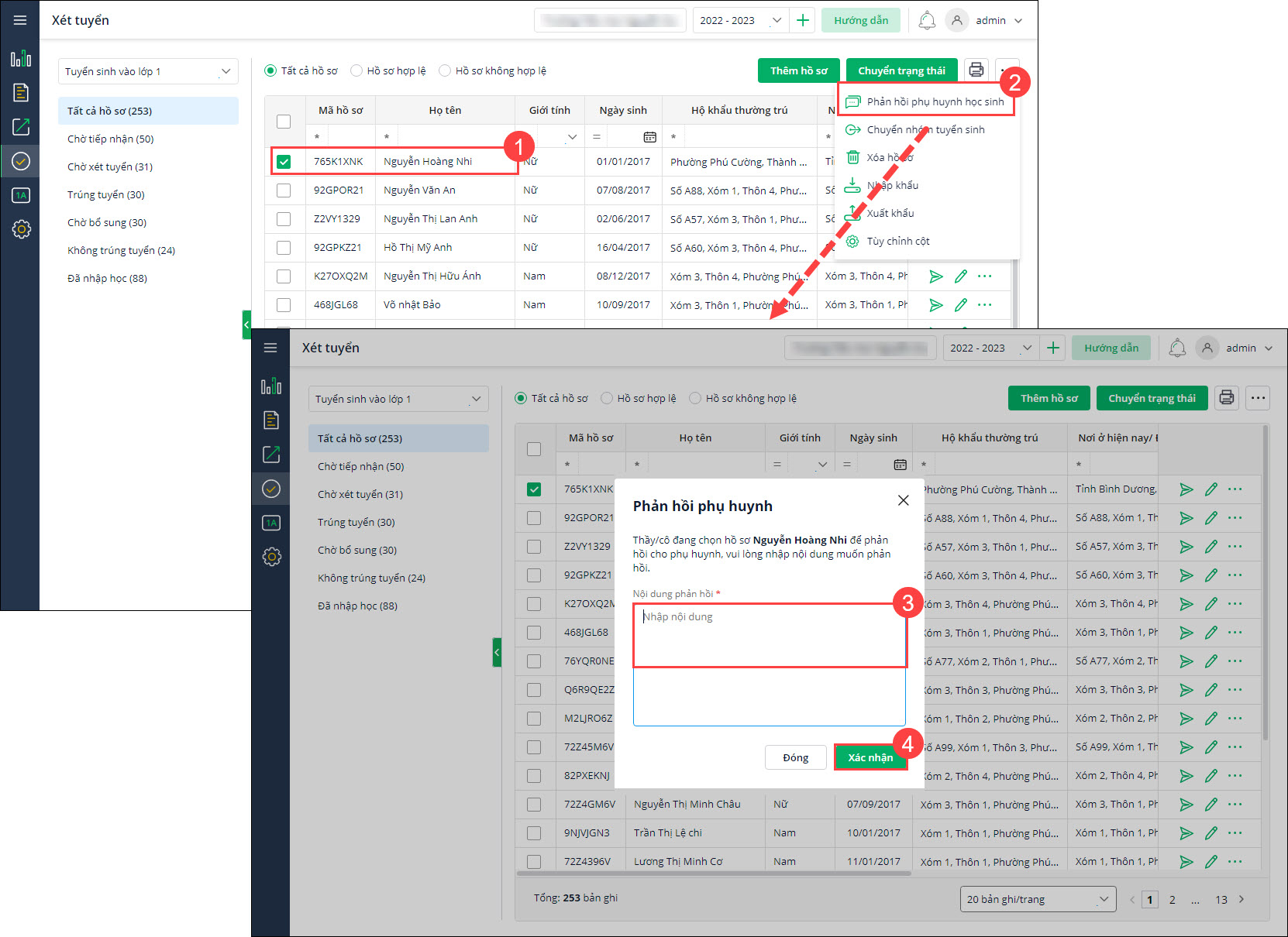- Ngoài ra, Cán bộ tuyển sinh còn có thể gửi phản hồi cho phụ huynh trên cổng tuyển sinh xuyên suốt giai đoạn tuyển sinh để phụ huynh kịp thời nắm bắt thông tin.
