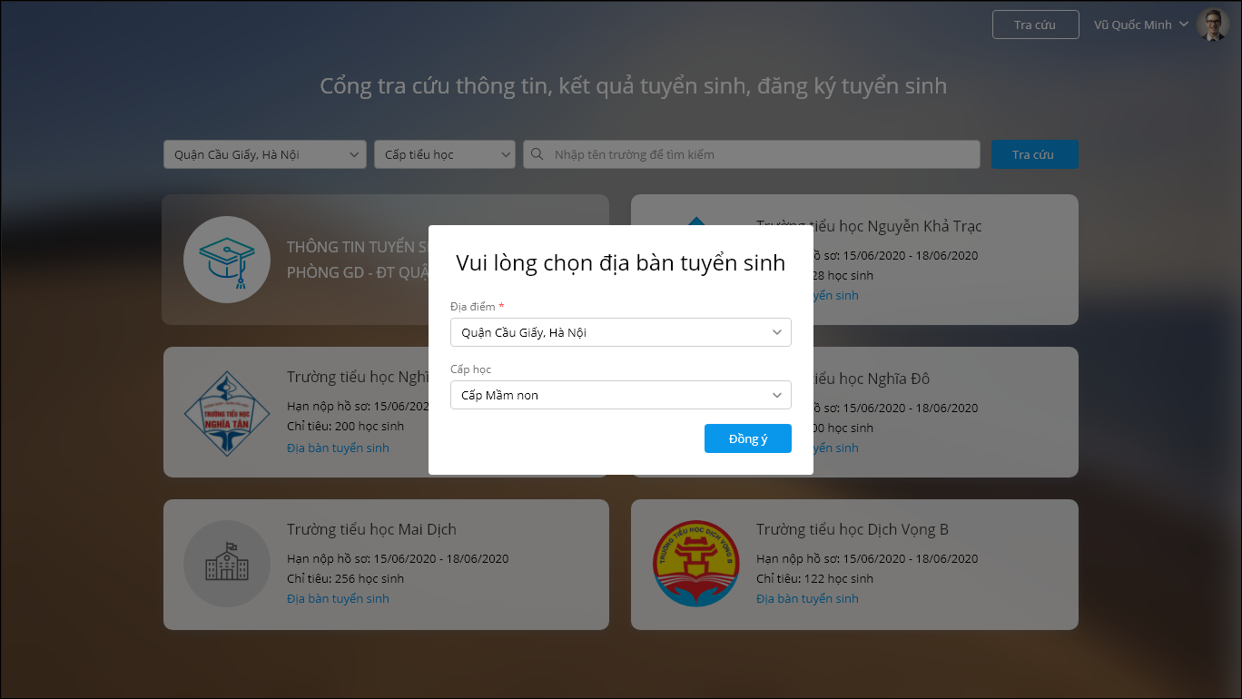 • Chọn trường theo kết quả tìm kiếm hoặc nhập tên trường anh/chị muốn nộp hồ sơ cho con em mình, nhấn Tìm kiếm.