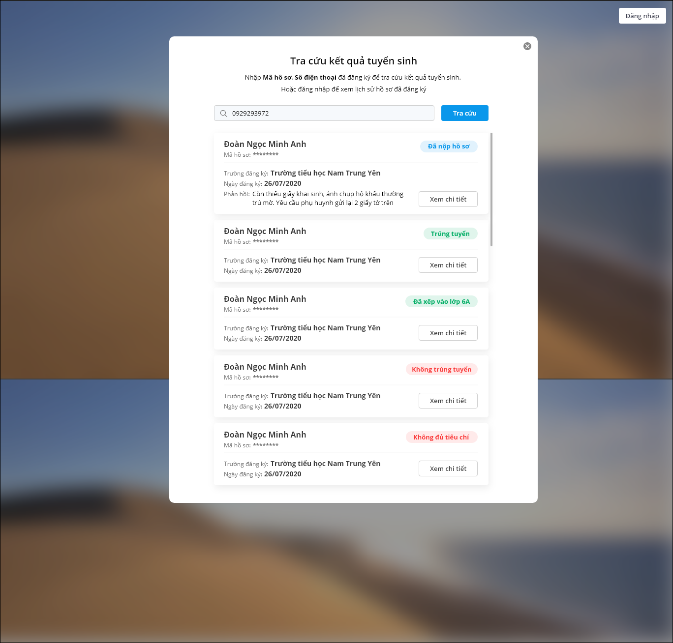 1. Phần mềm hiển thị danh sách hồ sơ mà anh/chị đã đăng ký tuyển sinh cho các con kèm trạng thái hồ sơ: Đã nộp hồ sơ, Trúng tuyển, Không trúng tuyển, Đã xếp lớp, và Không đủ tiêu chí kèm theo phản hồi từ nhà trường (nếu có)