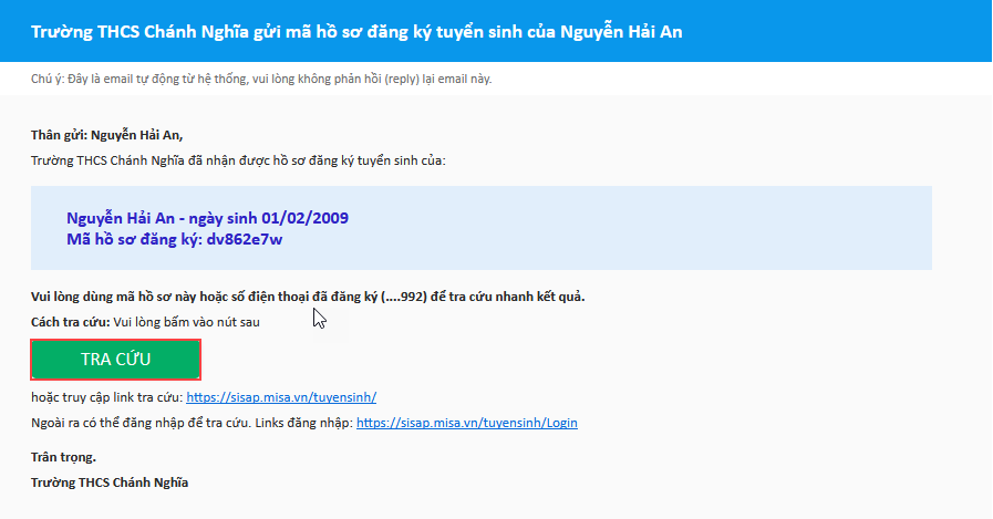 • Khi ấn nút tra cứu từ mail thông báo, phụ huynh phải mất thời gian nhập mã hồ sơ đăng kí ở Tra cứu để kiểm tra thông tin hồ sơ của con.