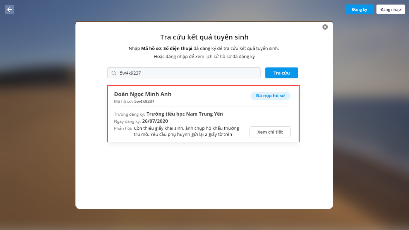 Trường hợp nhấn Tra cứu ngay trên mail thông báo, phần mềm tự động điền mã hồ sơ giúp phụ huynh tiết kiệm thời gian tra cứu.