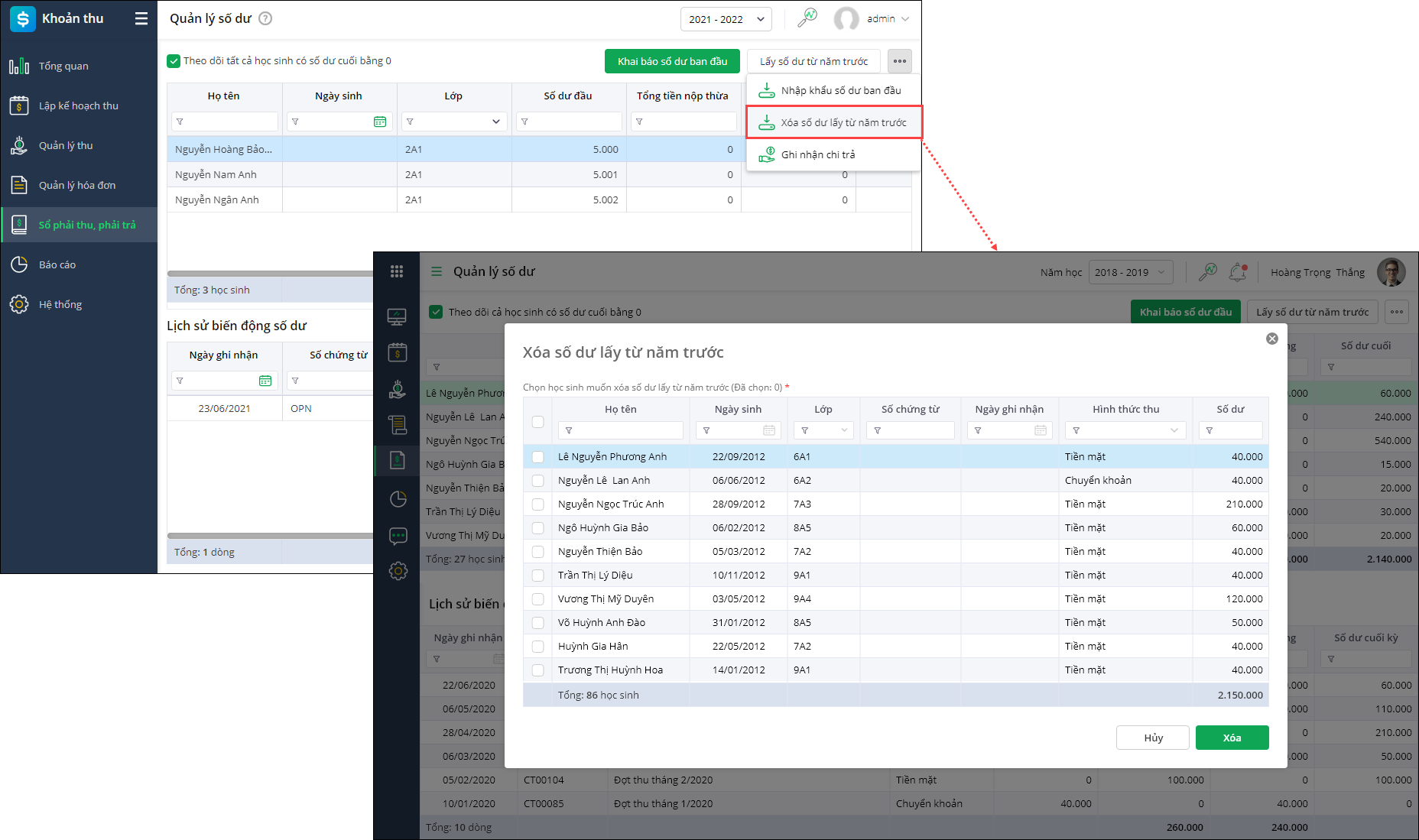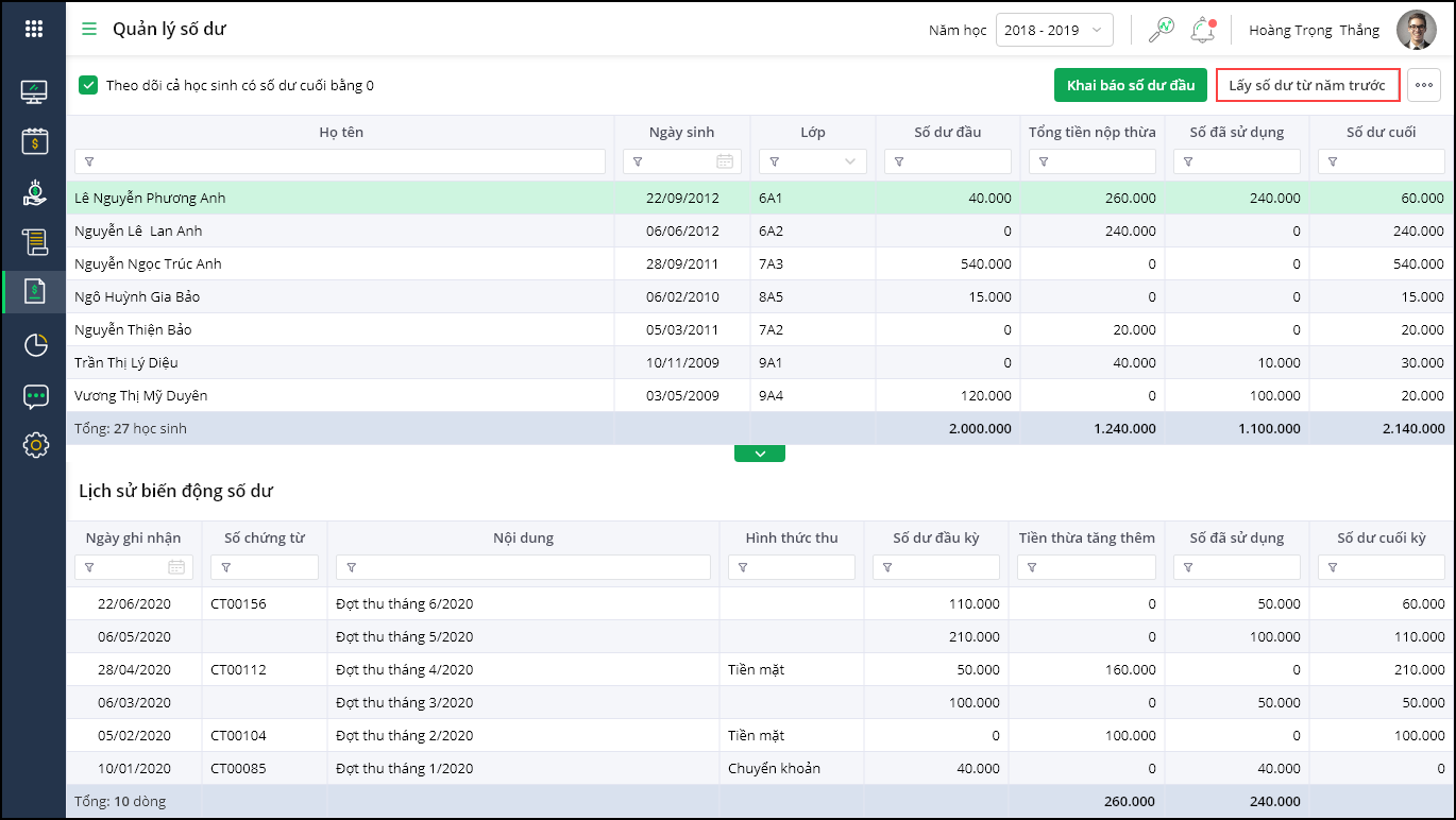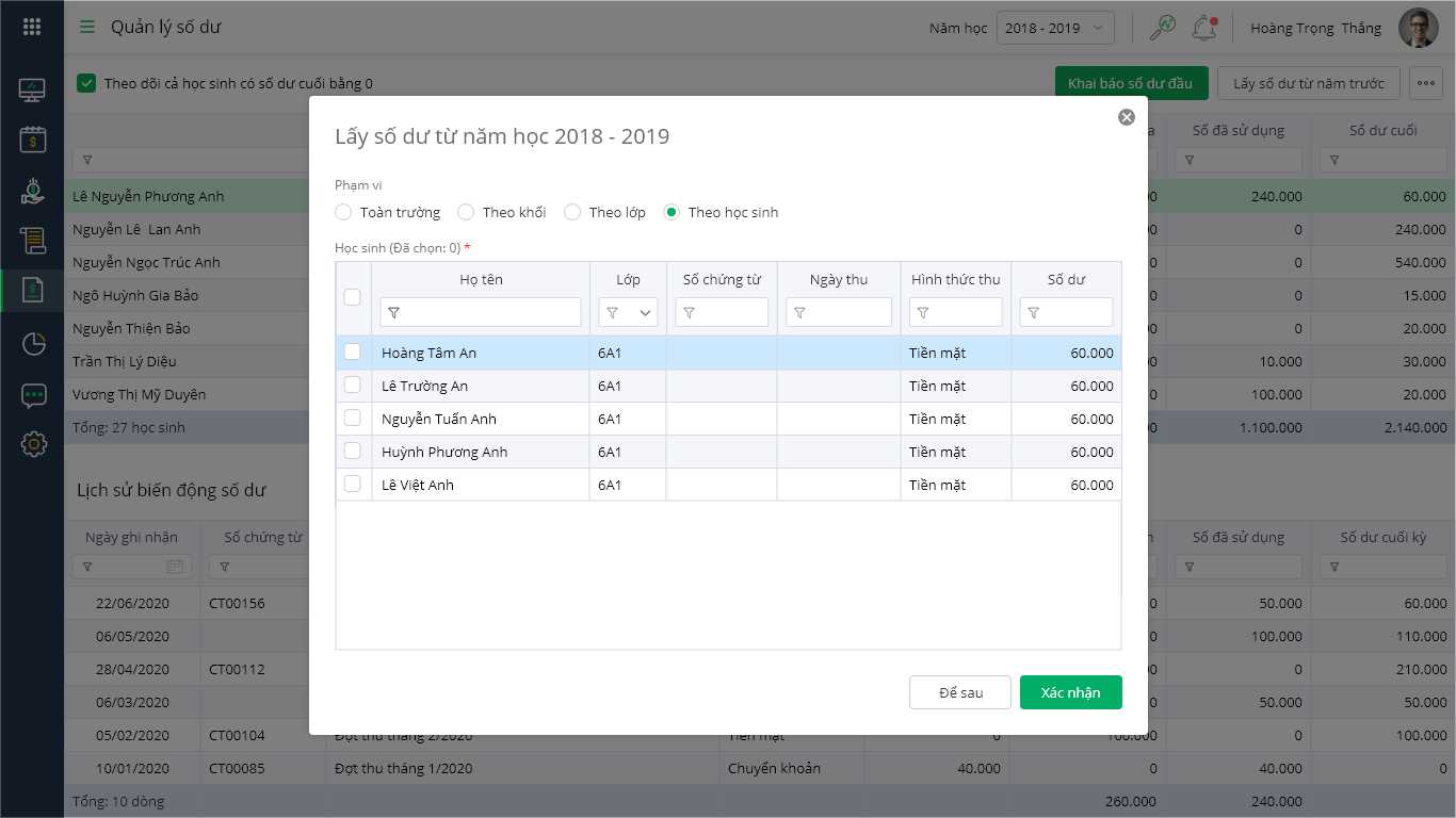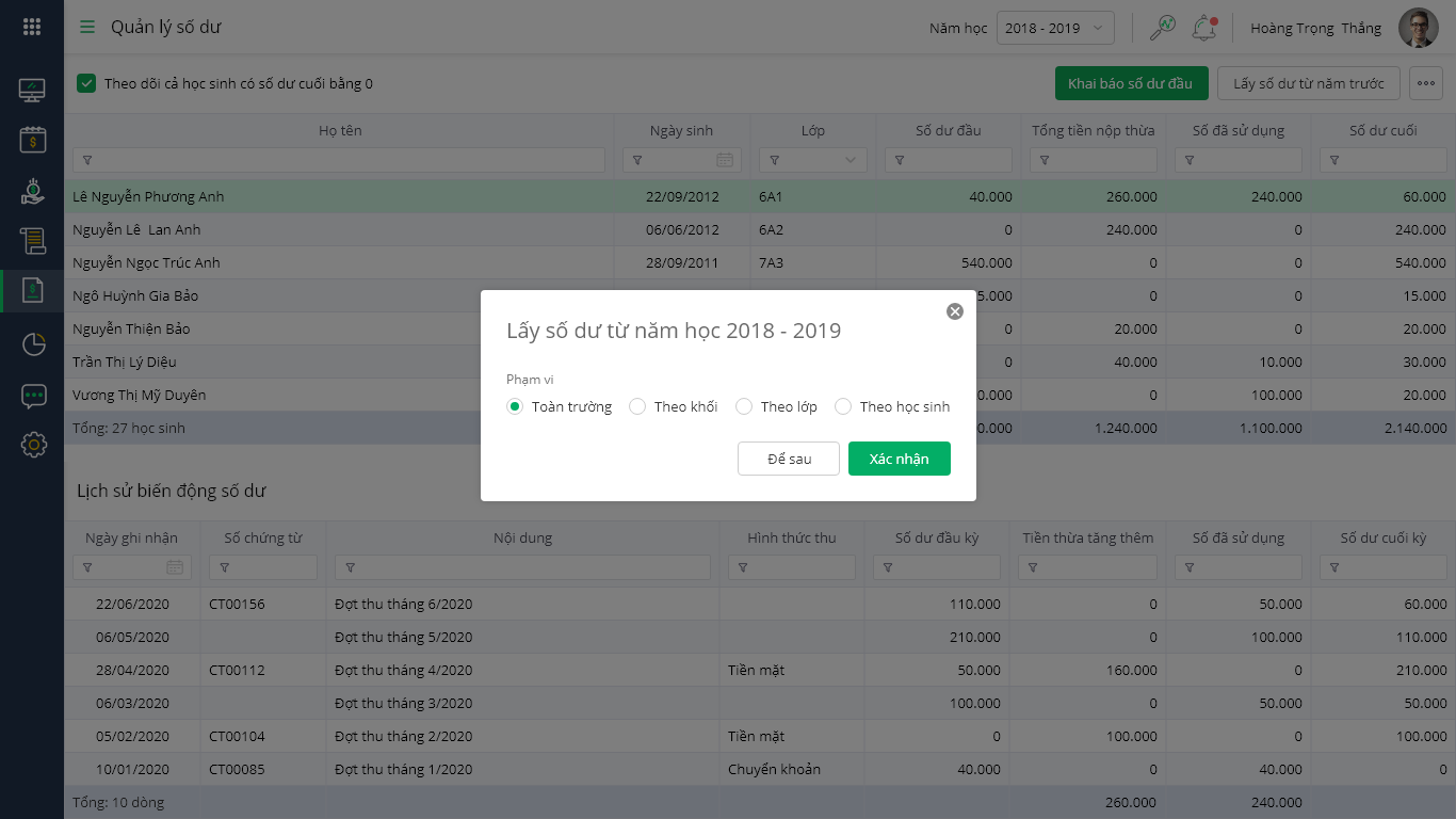 - Nhấn Xác nhận. Số dư của năm trước (nếu có) được phần mềm mặc định mang sang năm học mới.