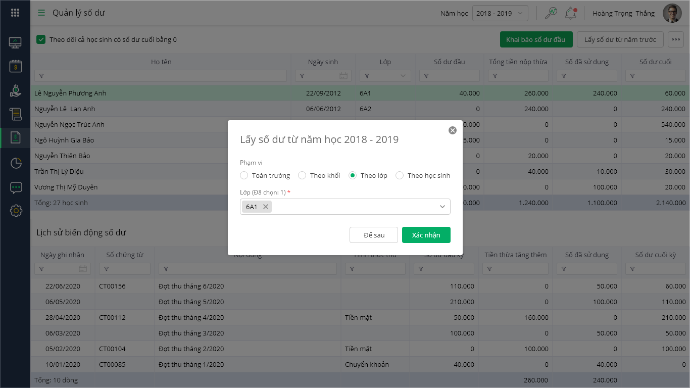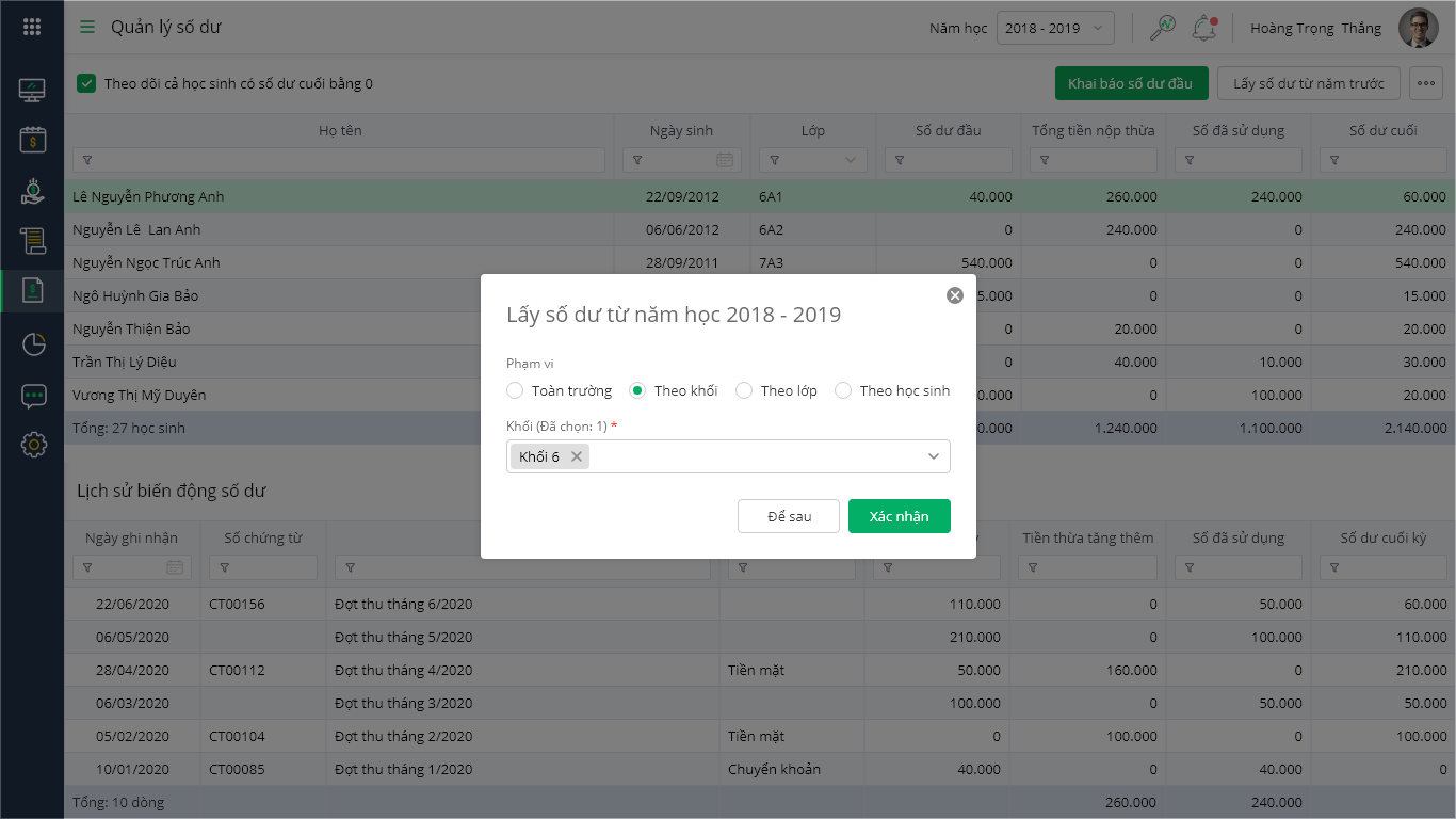 - Nhấn Xác nhận. Số dư của năm trước (nếu có) được phần mềm mặc định mang sang năm học mới.