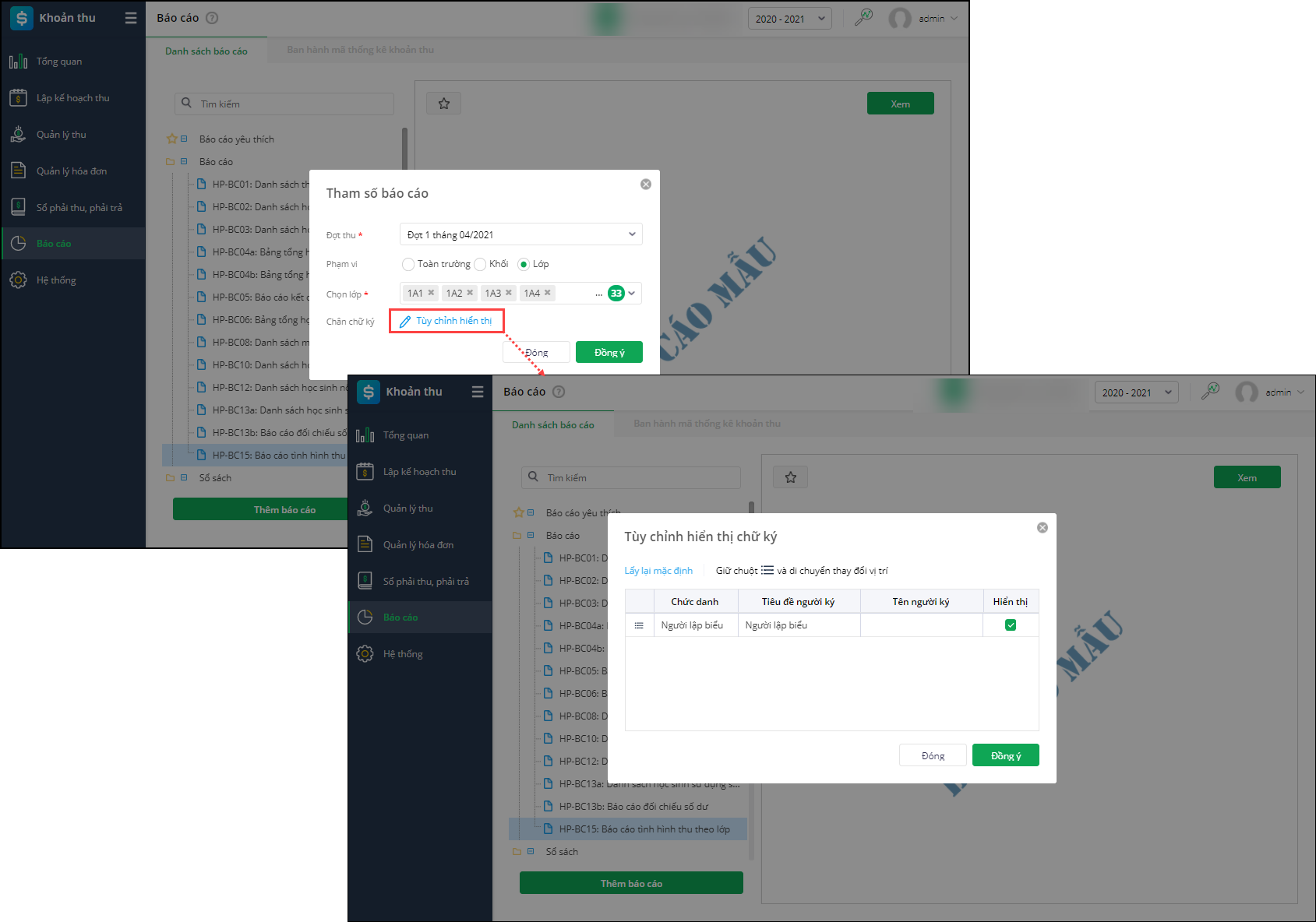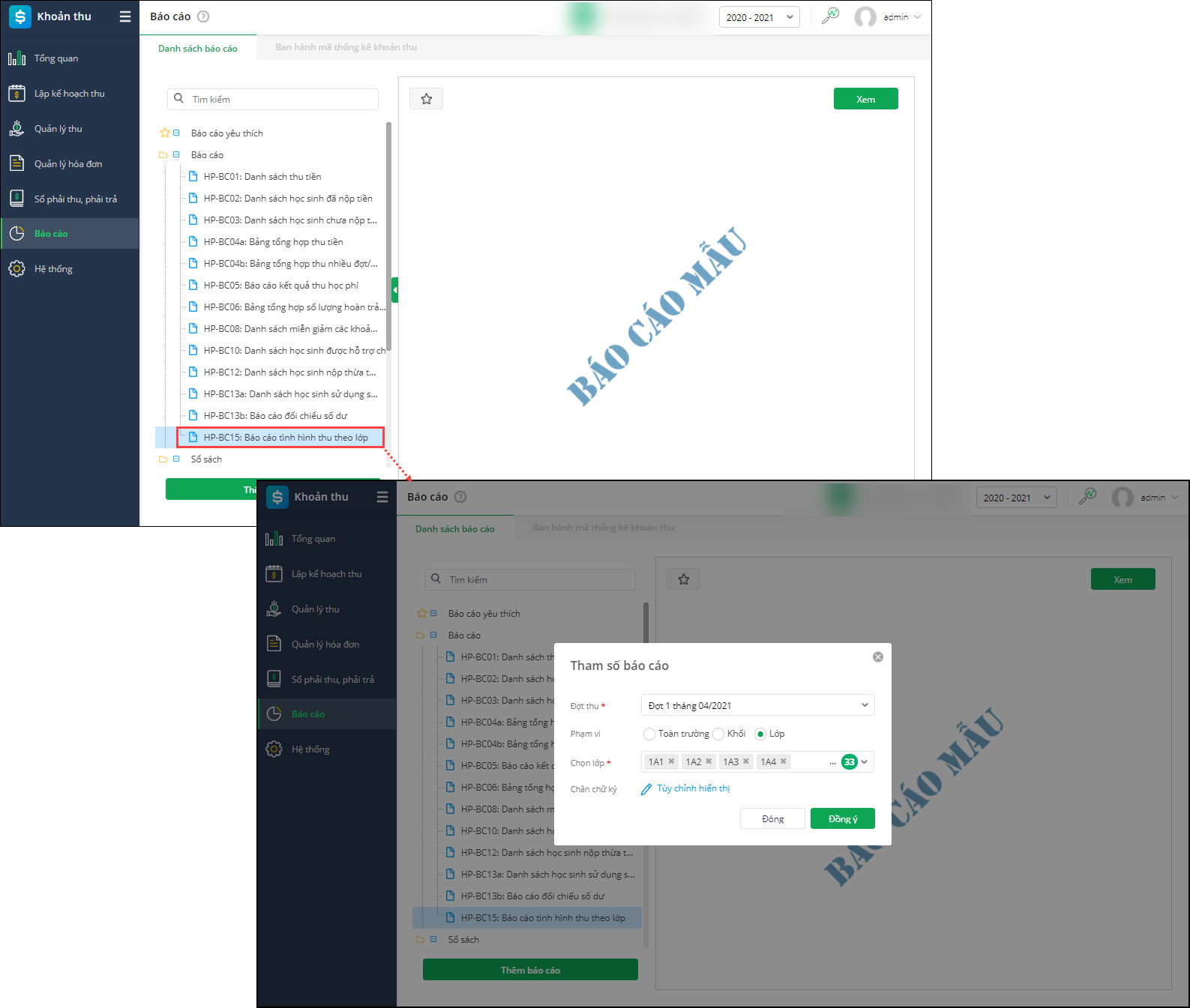 - Vào Báo cáo/Danh sách báo cáo/HP-BC15: Báo cáo tình hình thu tiền theo lớp