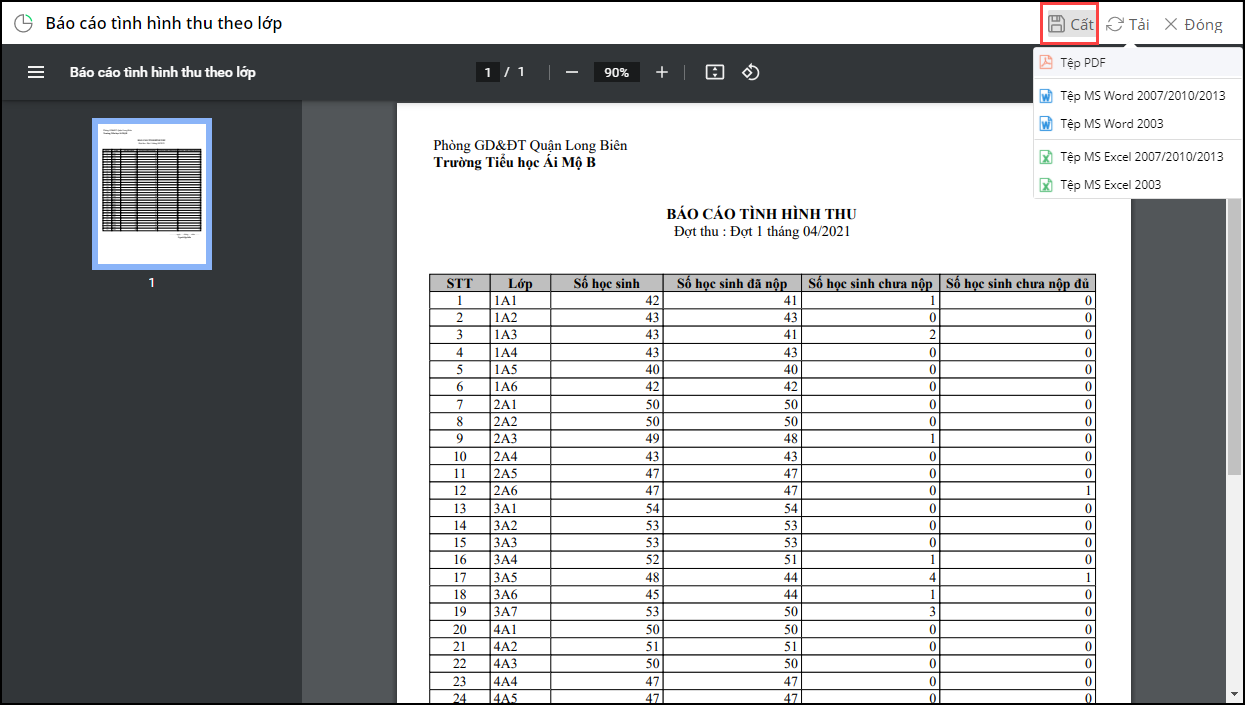 - Kiểm tra số liệu trên báo cáo. Nhấn vào biểu tượng dưới đây để lưu báo cáo theo các định dạng Word, Excel, PDF.