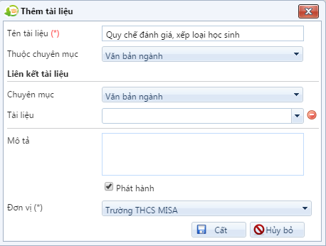 Lưu ý: Với những tài liệu chưa muốn cho toàn bộ cán bộ, giáo viên trong trường được phép nhìn thấy (do nội dung chưa được đầy đủ,…), khi khai báo tài liệu, sẽ không tích chọn Phát hành. Khi nào tài liệu đã hoàn thiện, người dùng sẽ sử dụng chức năng Sửa, sau đó tích chọn Phát hành và chọn bộ phận được xem tài liệu này (theo cả trường hoặc các tổ chuyên môn).