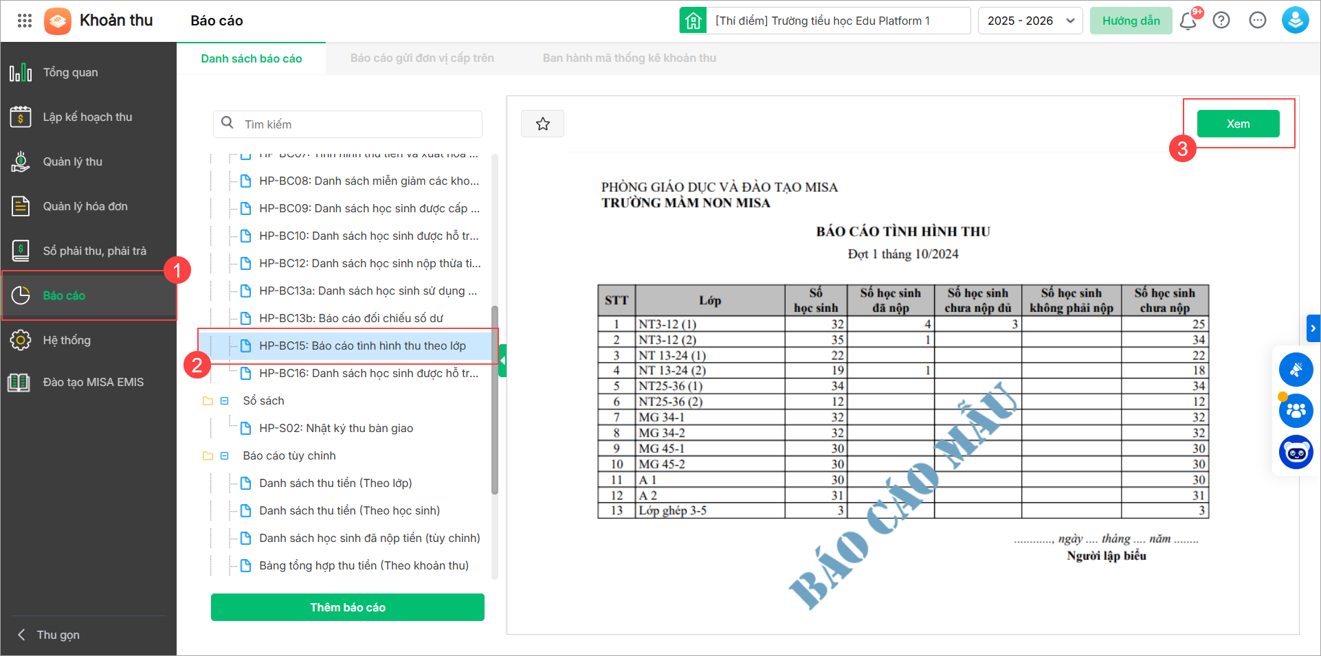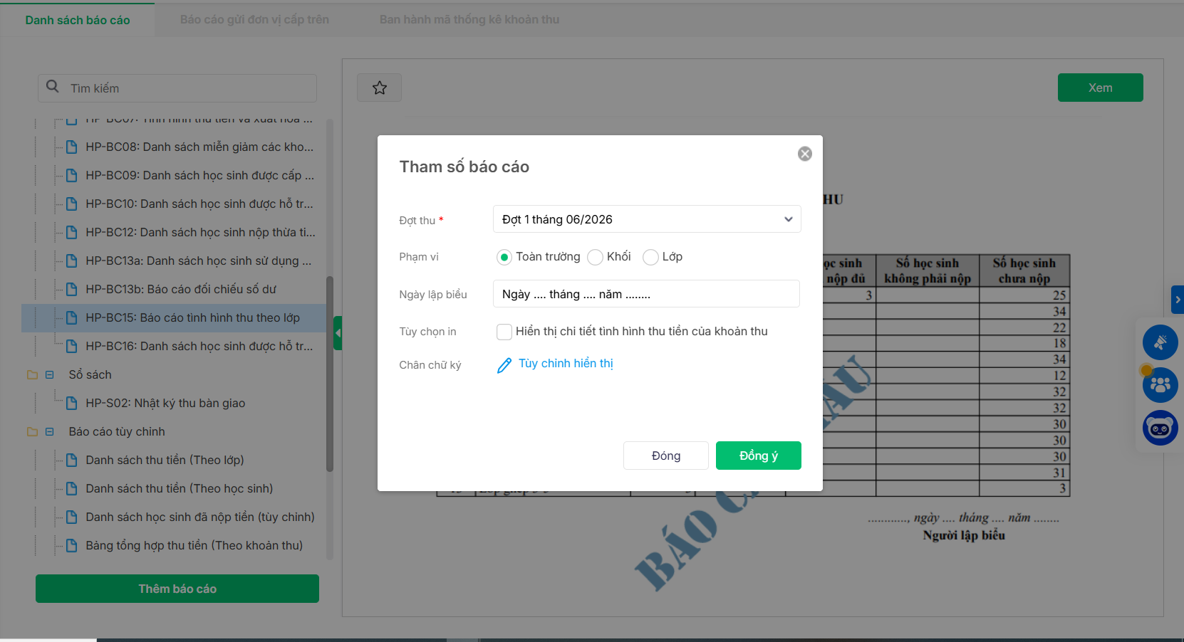 2. [EMIS Khoản thu] HP-BC15: Báo cáo tình hình thu theo lớp