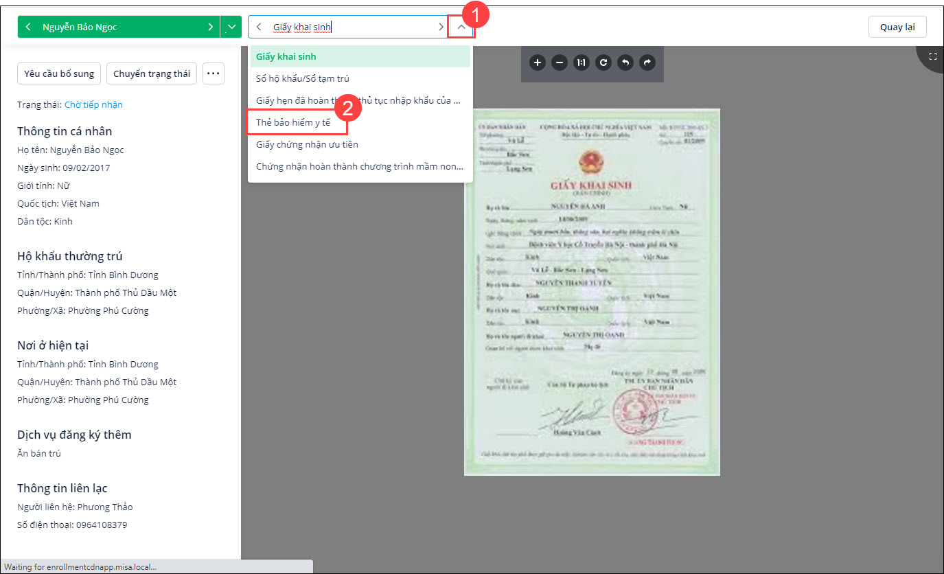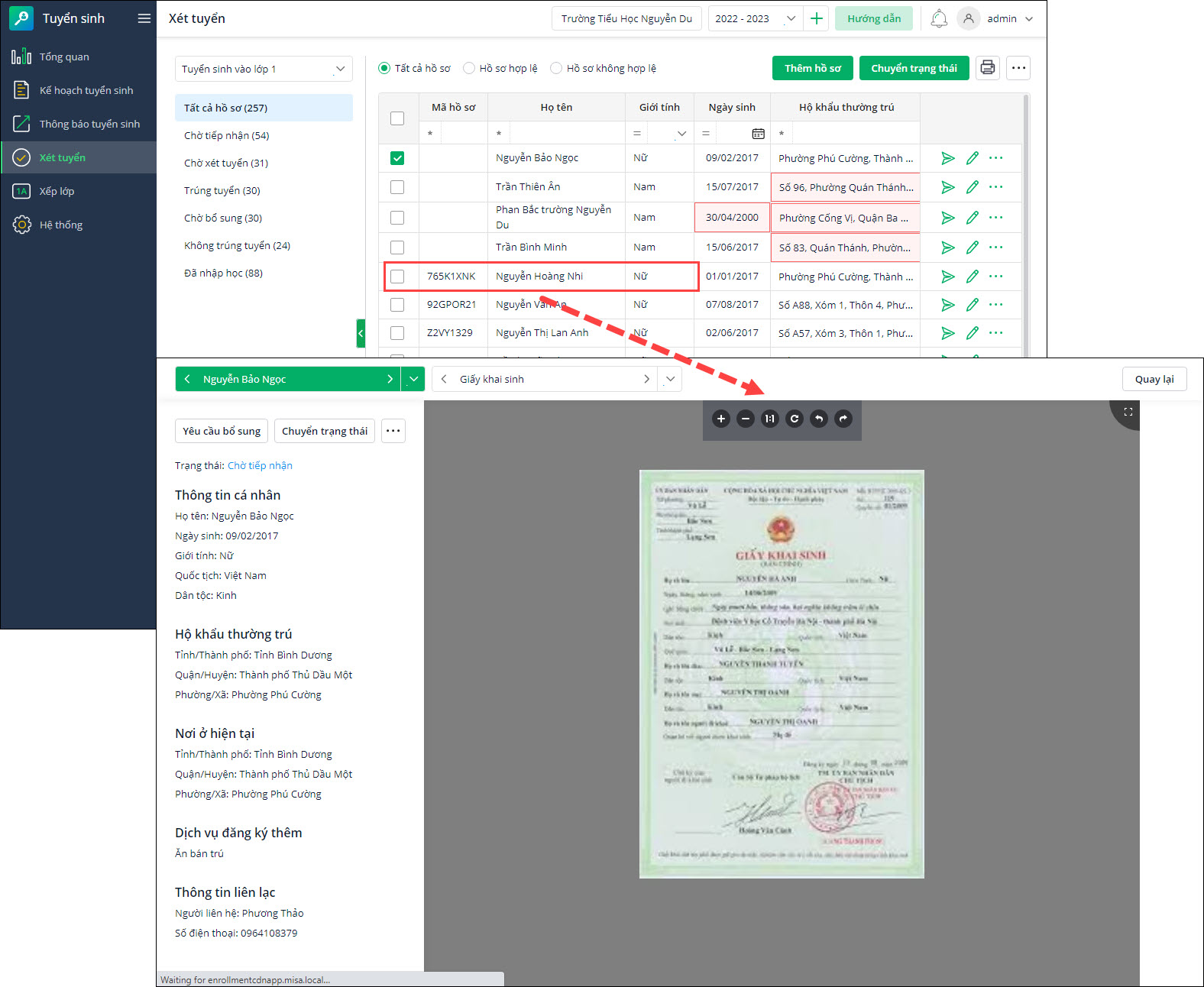 - Vào Xét tuyển, nhấn chọn học sinh để xem chi tiết hồ sơ tuyển sinh. Tại đây, anh/chị có thể xem luôn các giấy tờ phụ huynh gửi kèm trong hồ sơ.