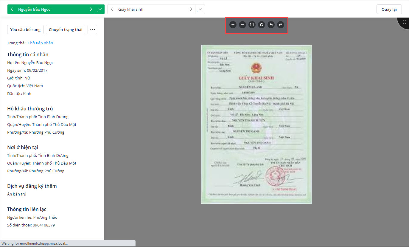 Mục đích: Giúp Cán bộ tuyển sinh dễ dàng xem các tệp đính kèm hồ sơ xét tuyển với các tính năng phóng to, thu nhỏ, xoay ảnh.