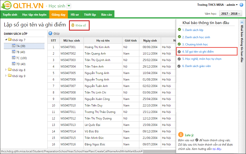Lưu ý: Những lớp nào không có học sinh, khi Khóa sổ Sổ gọi tên và ghi điểm thì những lớp này sẽ bị xóa đi.