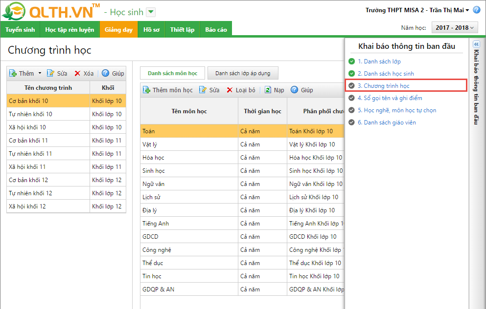 Cho phép khai báo các chương trình học của các khối lớp, danh sách các môn học cùng các lớp áp dụng các chương trình học đó, để có thể phân chia được các môn học cho từng khối lớp chuyên hay không chuyên, ban cơ bản hay ban tự nhiên… từ đó lập được thời khóa biểu cho từng lớp và thiết lập hệ thống sổ điểm cho từng lớp.