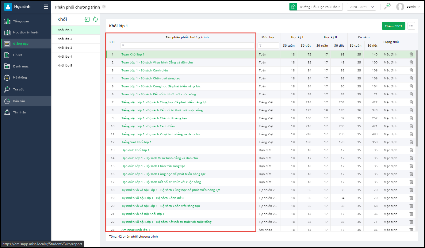 Tại đây, EMIS – Học sinh đã thiết lập một số phân phối chương trình mặc định (dựa vào thông tin Cấp trường) tương ứng theo nhu cầu giảng dạy tại trường. Đông thời, Đồng nhất thông tin Bộ sách học sinh lớp 1 Theo Thông tư của Bộ giáo dục và đào tạo về cải tiến chất lượng giáo dục, giúp giáo viên tiết kiệm thời gian tự chỉnh sửa phân phối chương trình thủ công.