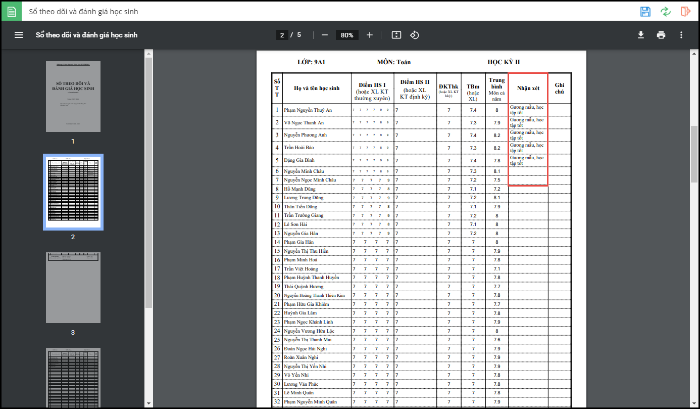 Giáo viên cấp THCS muốn khi in Sổ theo dõi và đánh giá học sinh sẽ có cột Nhận xét