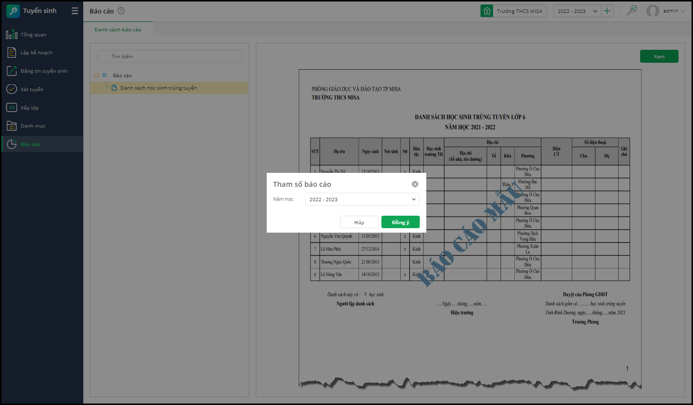 - Vào Tuyển sinh\Báo cáo\Danh sách trúng tuyển