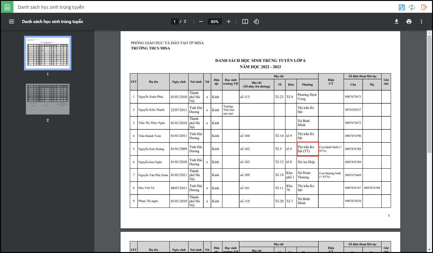 - Từ phiên bản R115: Cán bộ tuyển sinh in báo cáo Danh sách học sinh trúng tuyển đầy đủ thông tin thường trú, tạm trú để PGD có thể nắm bắt cũng như phê duyệt danh sách học sinh trúng tuyển.