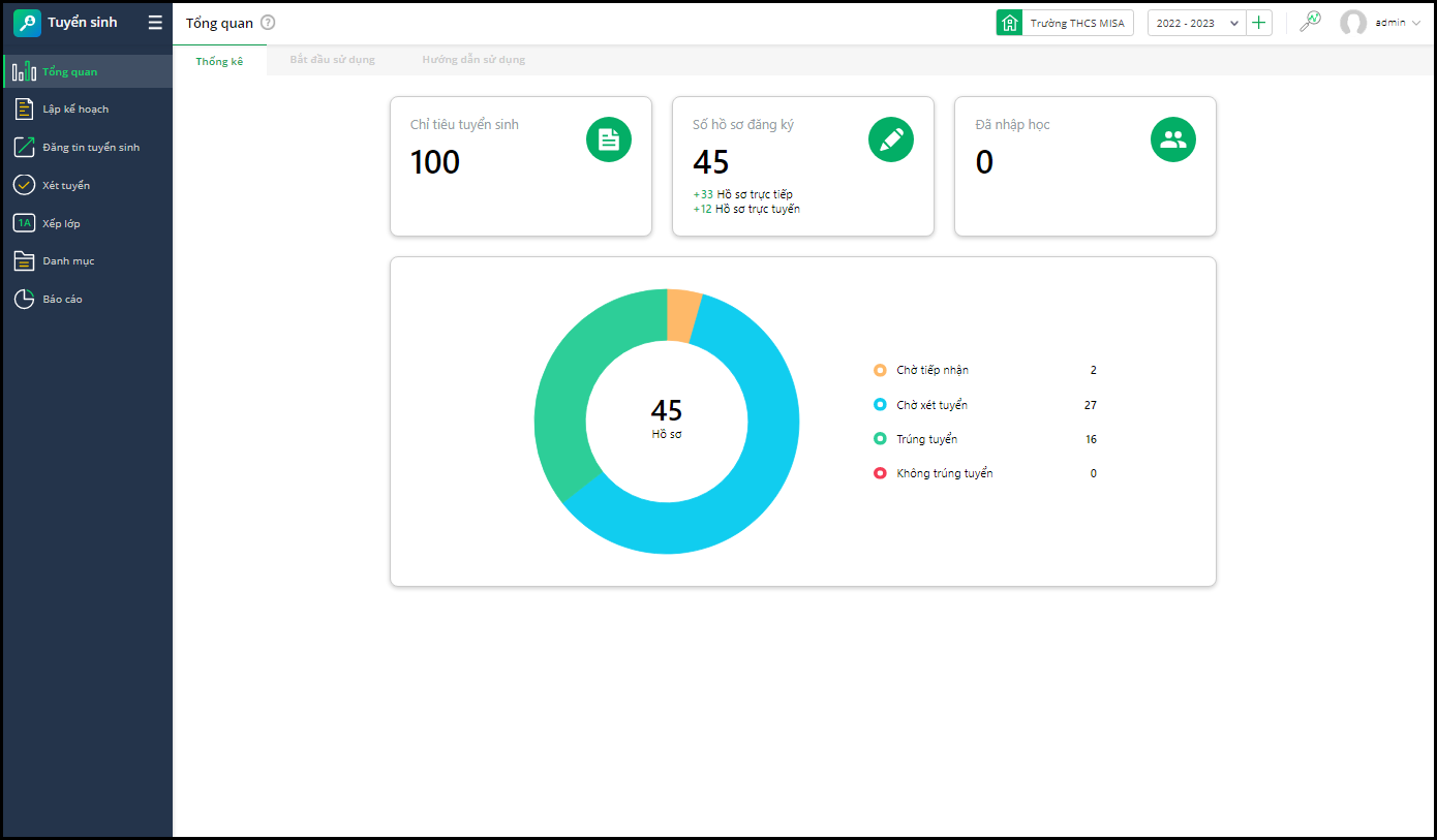 - Tại đây nhà trường có thể dễ dàng theo dõi được thống kê tình hình tuyển sinh tại trường:
