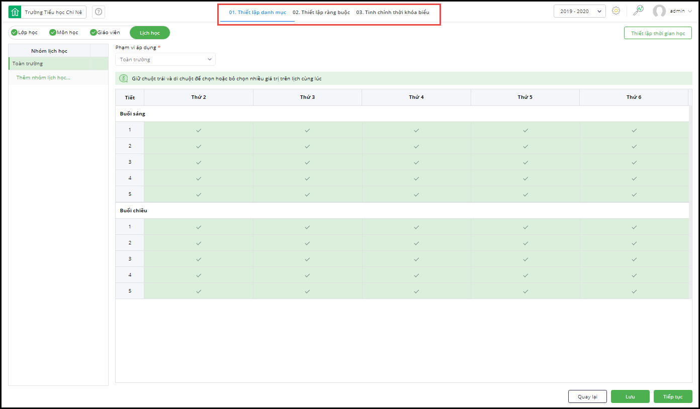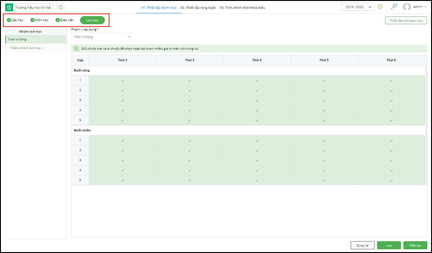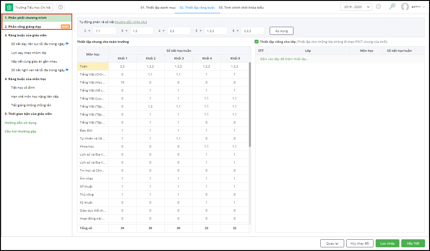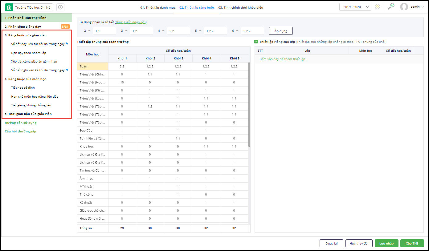 Ràng buộc thời khóa biểu được thiết lập lần lượt theo 5 nhóm chính.