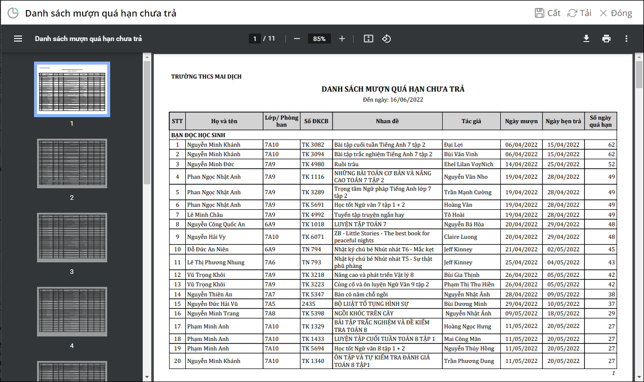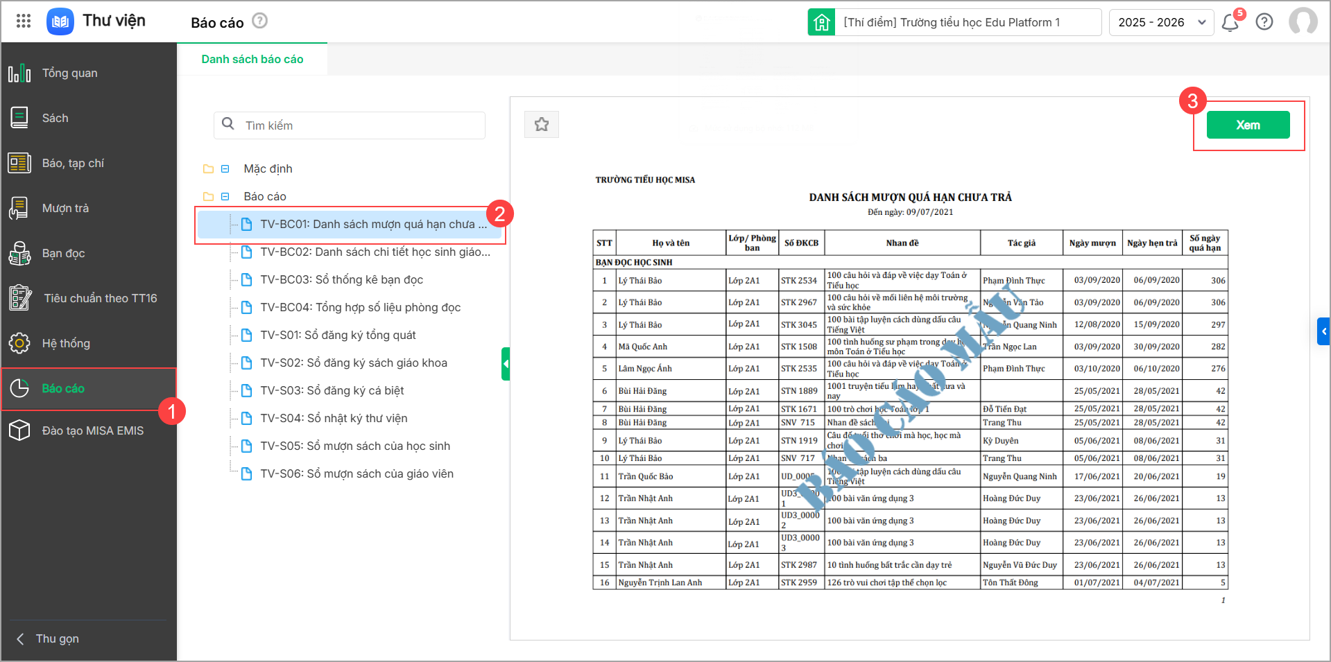 - Chọn Báo cáo\TV-BC01: Danh sách mượn quá hạn chưa trả
