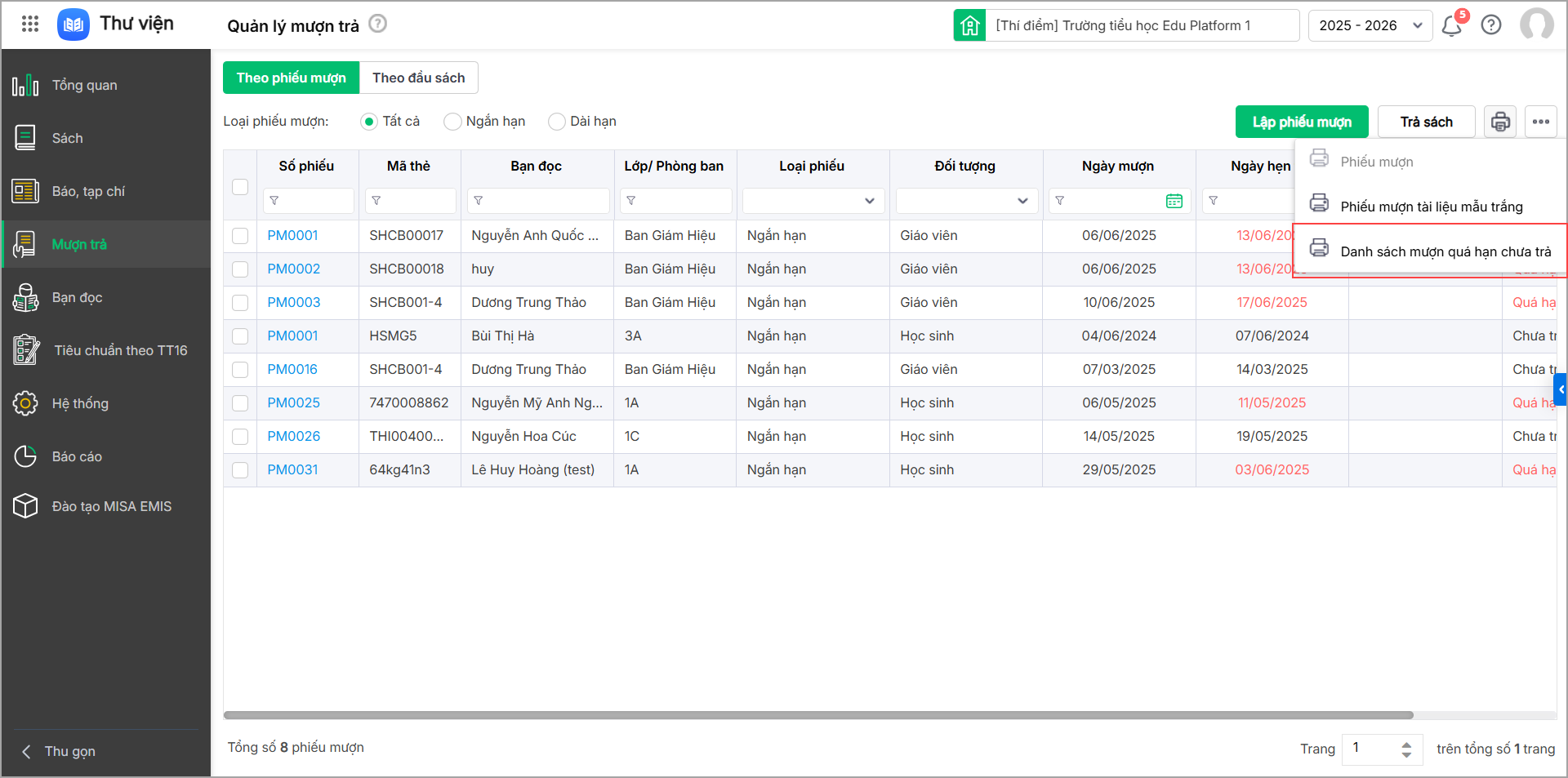 - Tại màn hình Quản lý mượn trả, nhấn vào Biểu tượng máy in, chọn Danh sách phiếu mượn trả quá hạn.