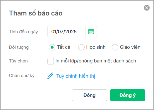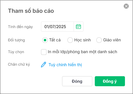 - Tích chọn In mỗi lớp/phòng ban một danh sách nếu muốn thống kê theo lớp/phòng ban để thuận tiện gửi GVCN lớp/Trưởng phòng nhắc nhở học sinh/giáo viên.
