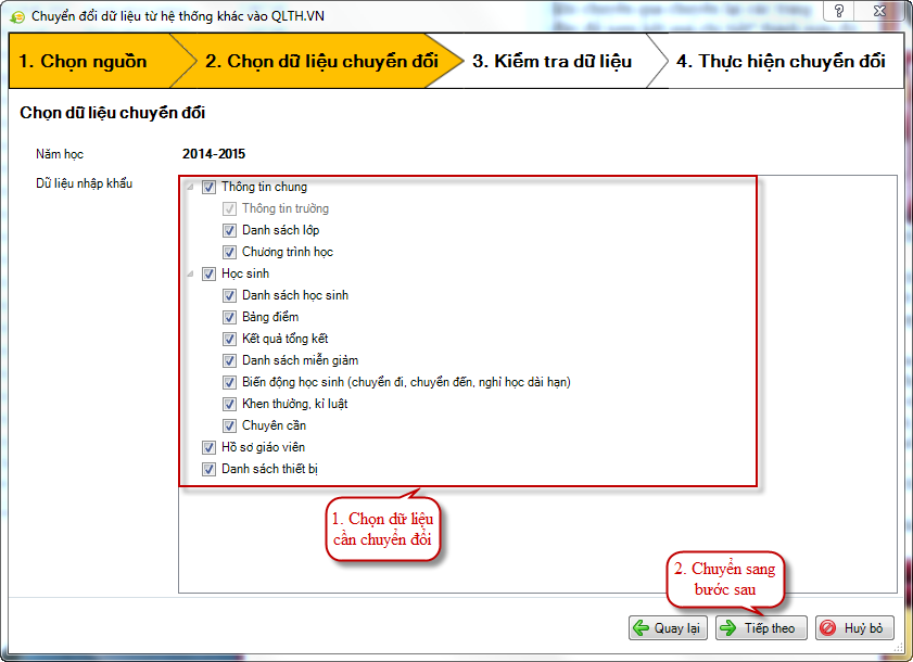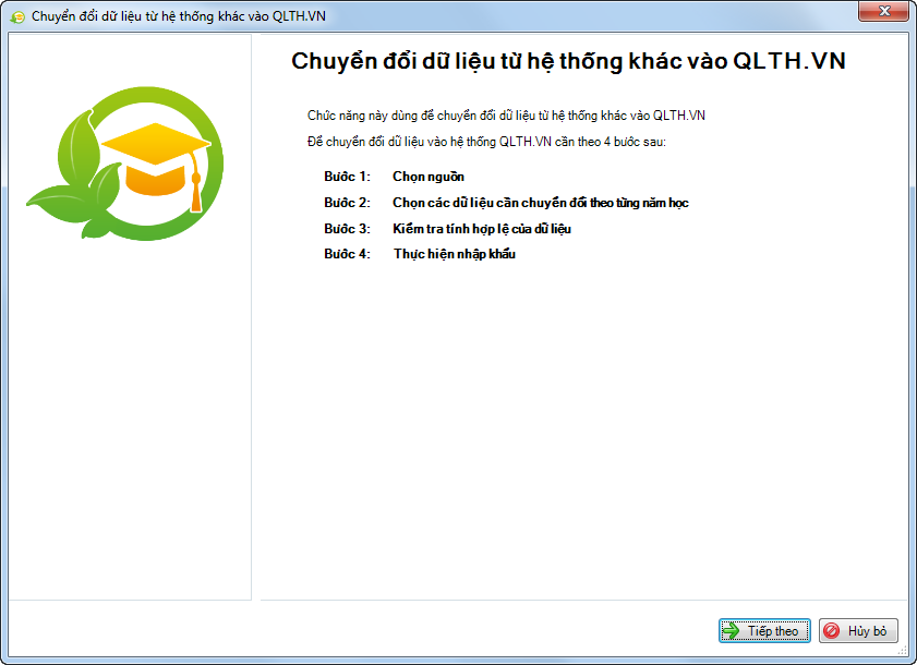 Tên đăng nhập và mật khẩu là tên đăng nhập và mật khẩu đăng nhập phần mềm QLTH.VN. - Chọn Chuyển đổi dữ liệu từ hệ thống khác