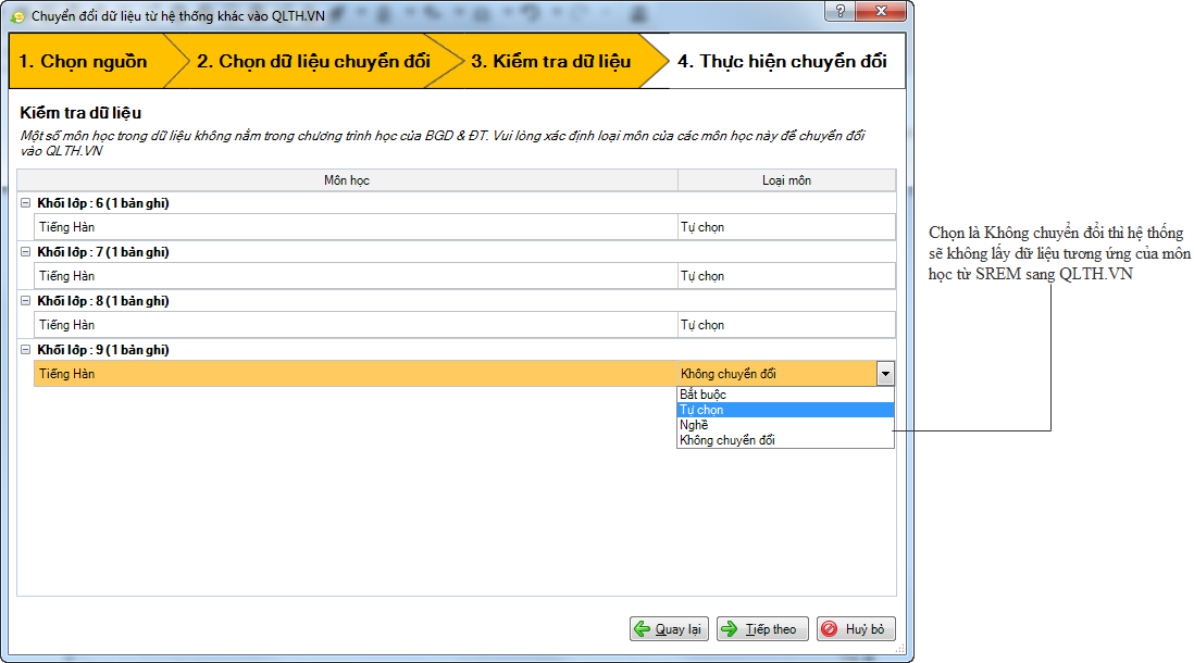 - Bước 3: Chọn loại môn cho các môn học có trên SREM mà chưa có trên phần mềm QLTH.VN và kiểm tra tính hợp lệ của dữ liệu