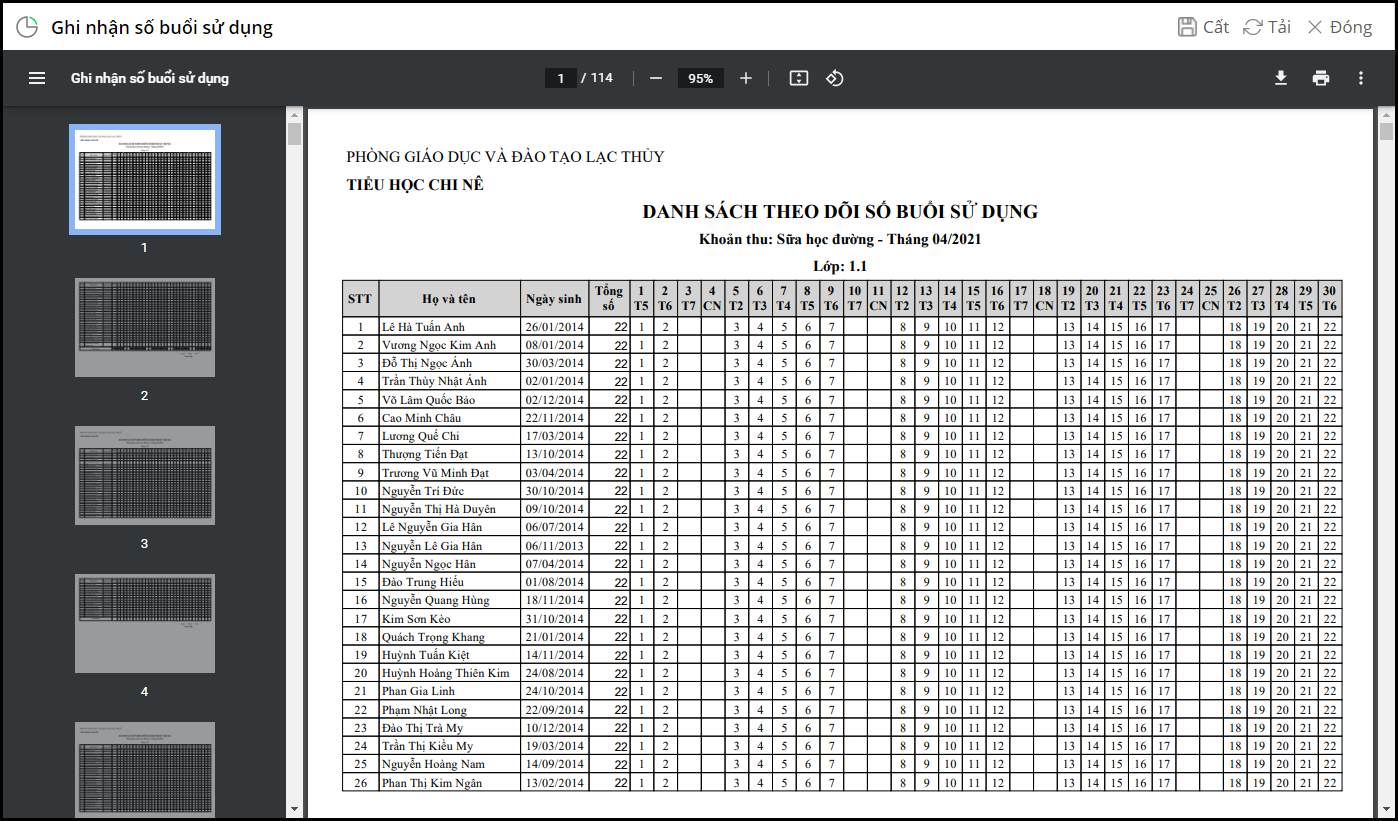 - Chi tiết để in danh sách theo dõi số buổi sử dụng chi tiết theo từng học sinh
